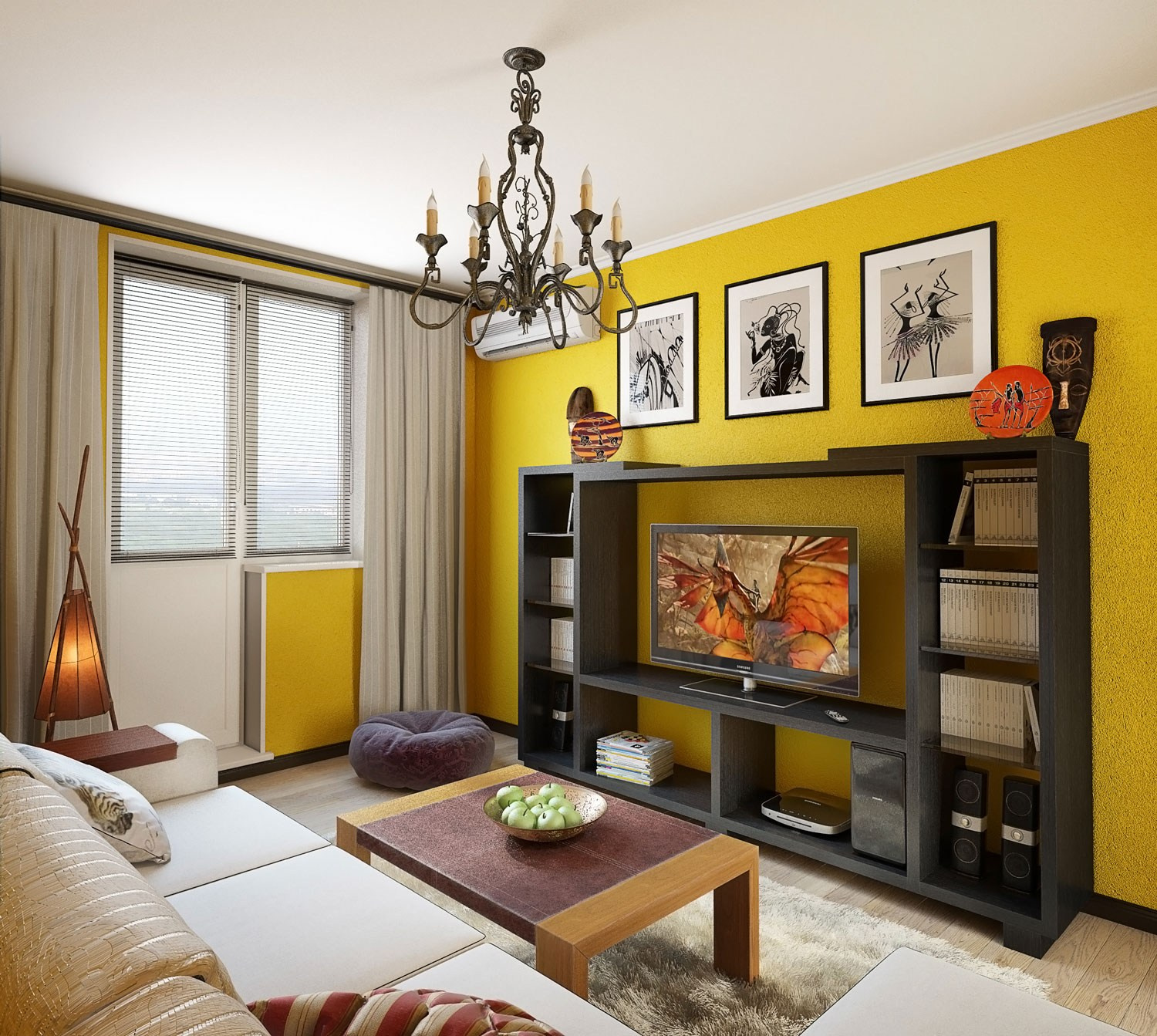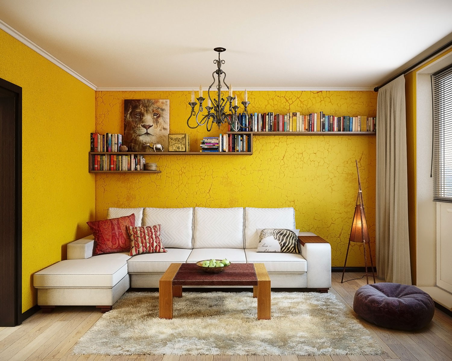 Ярко-желтые стены достаточно сильный акцент, поэтому все остальные элементы более нейтральные по цвету. Яркий фон уравновешивается молочными и коричневыми оттенками мебели и текстиля.