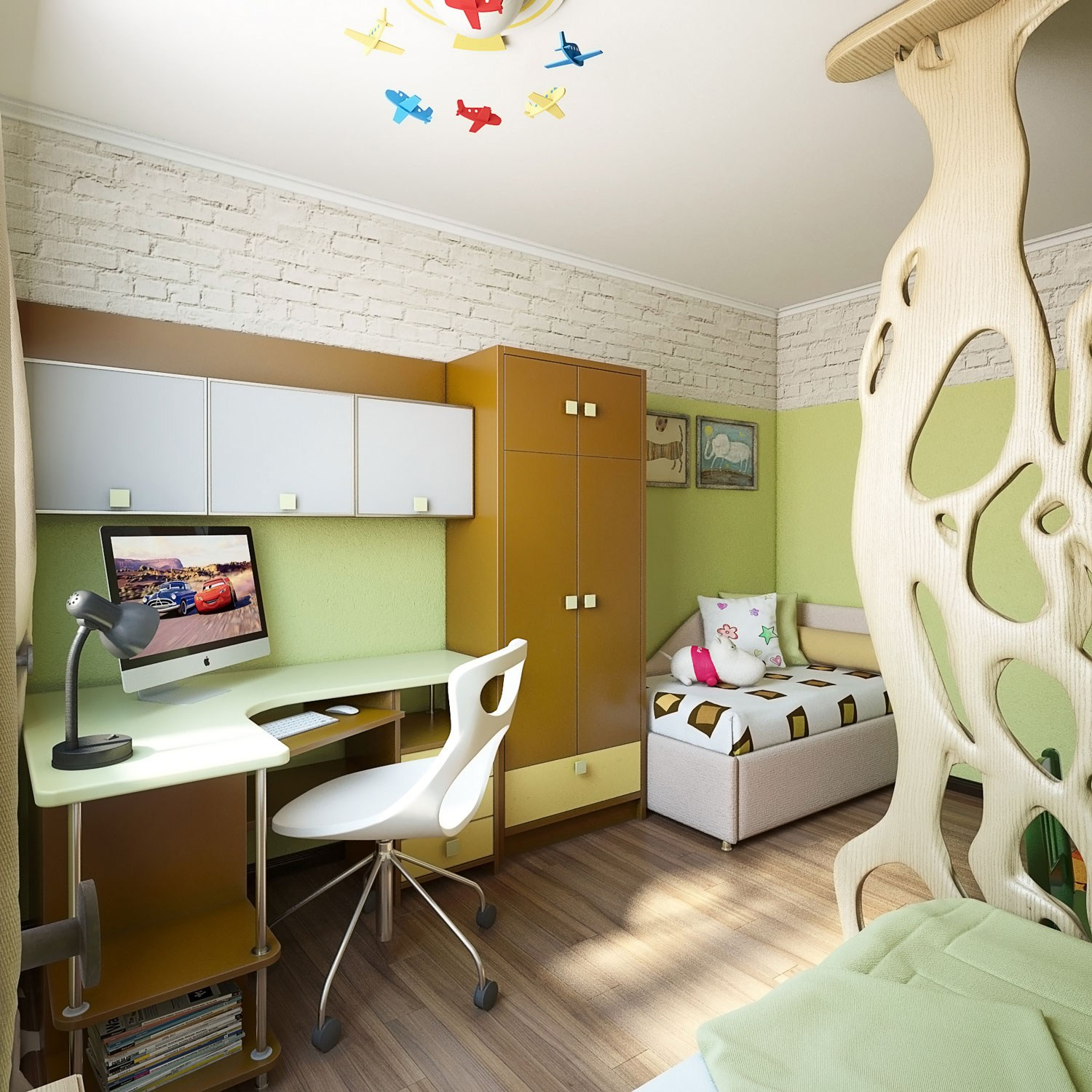 Старшему сыну 10 лет, он школьник и ему требуется достаточно места для учебы и отдыха. Около окна в детской мы поставили угловой компьютерный стол, а напротив стола установили кровать с выдвижными ящиками.