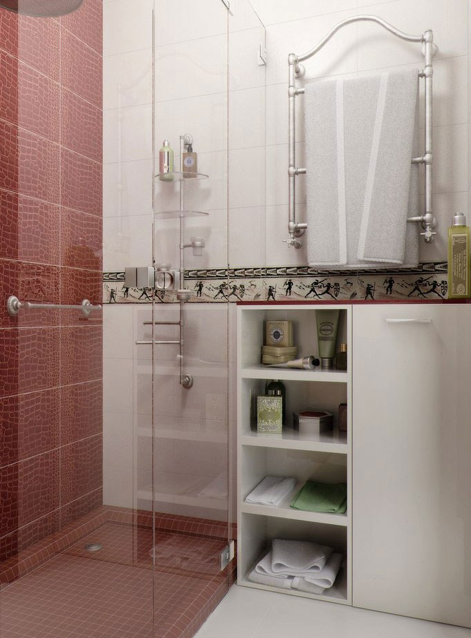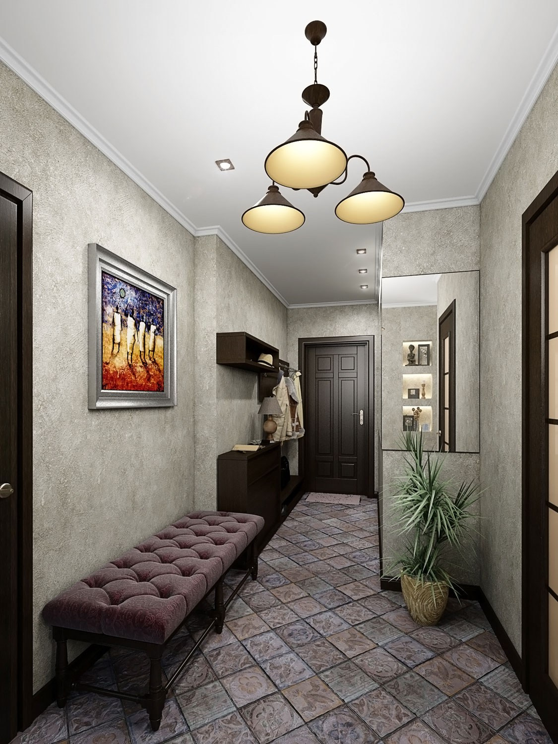Помещение самое спокойное по цвету. Акцент — мелкая напольная плитка с состаренным эффектом.