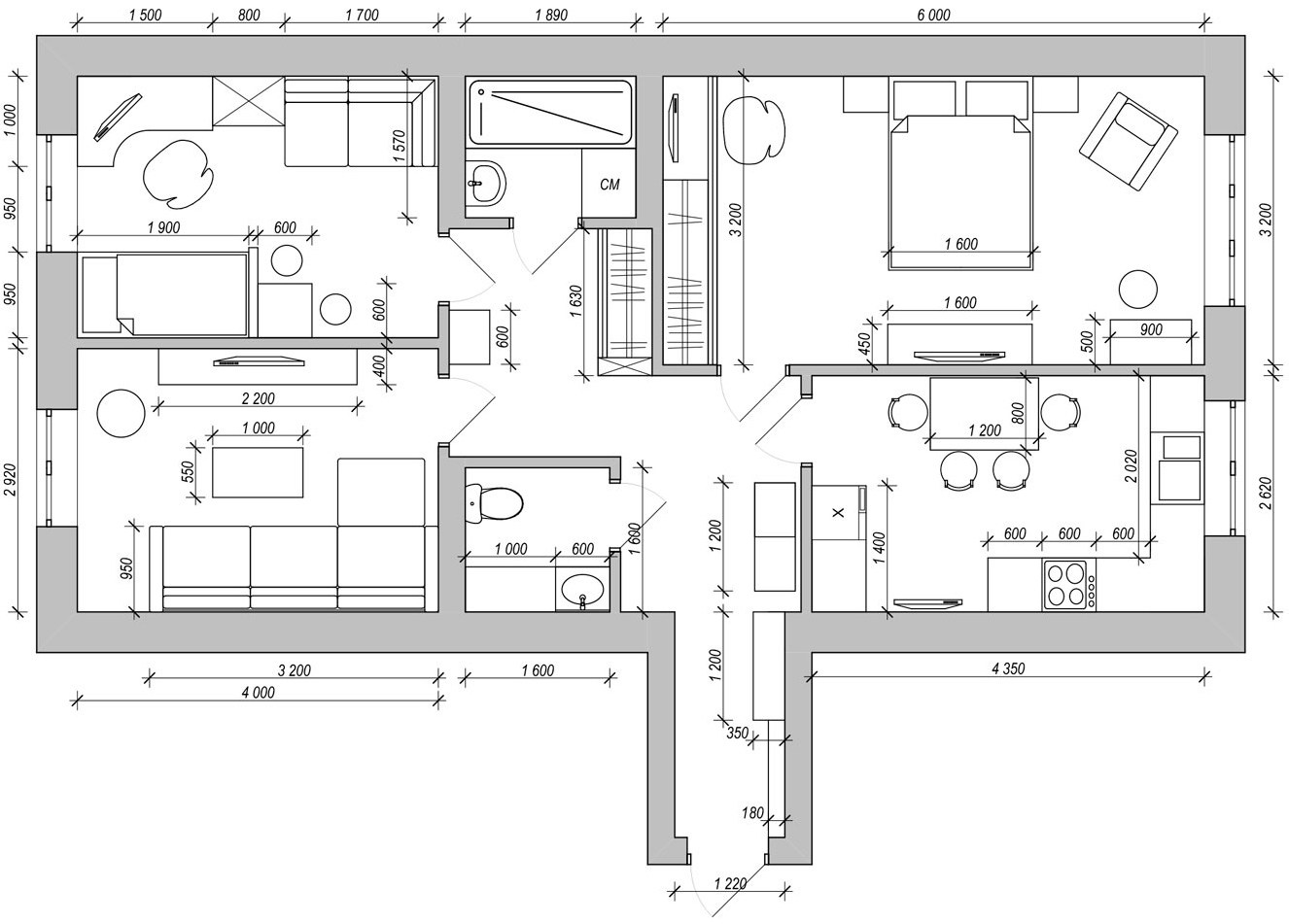 Наши клиенты — супруги с двумя сыновьями. Для них такая планировка это хороший вариант, у каждого есть личное пространство, можно заниматься своими делами и не тревожить других. Большую комнату отвели под родительскую спальню с рабочим местом, в остальных комнатах организовали детскую и гостиную.