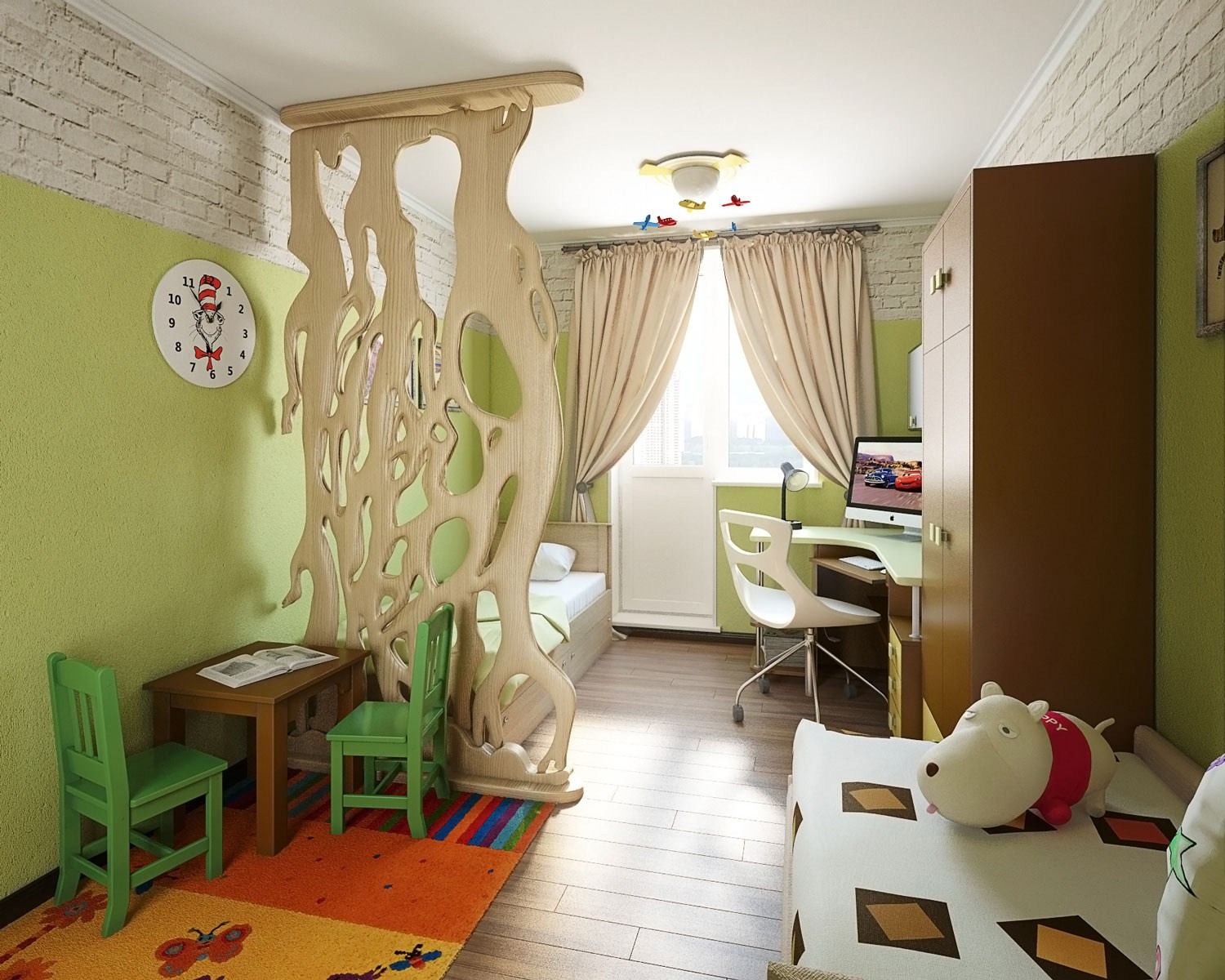 Младшему брату 5 лет и для него организована личная территория с игровой зоной. Резная деревянная перегородка отделяет одну зону от другой и служит интересным декоративным акцентом.