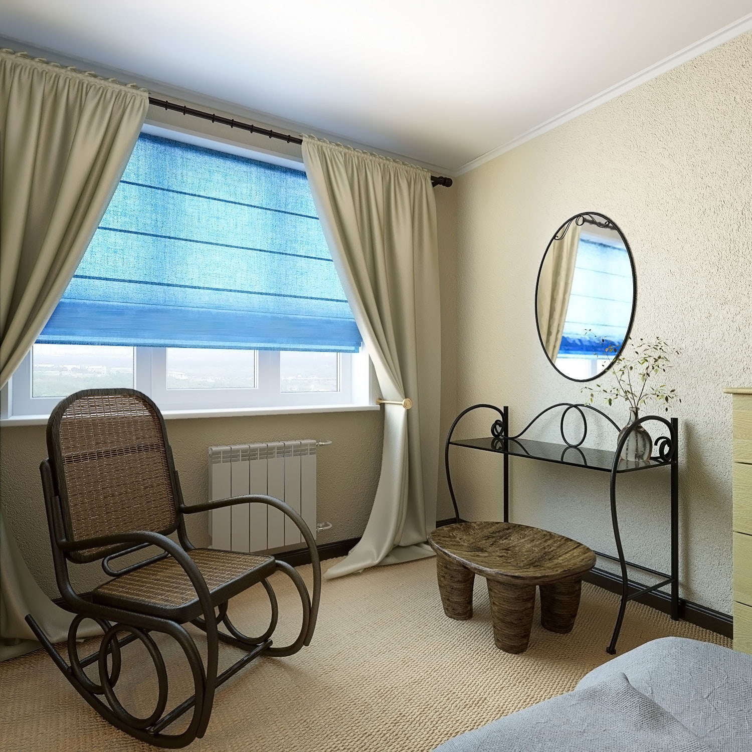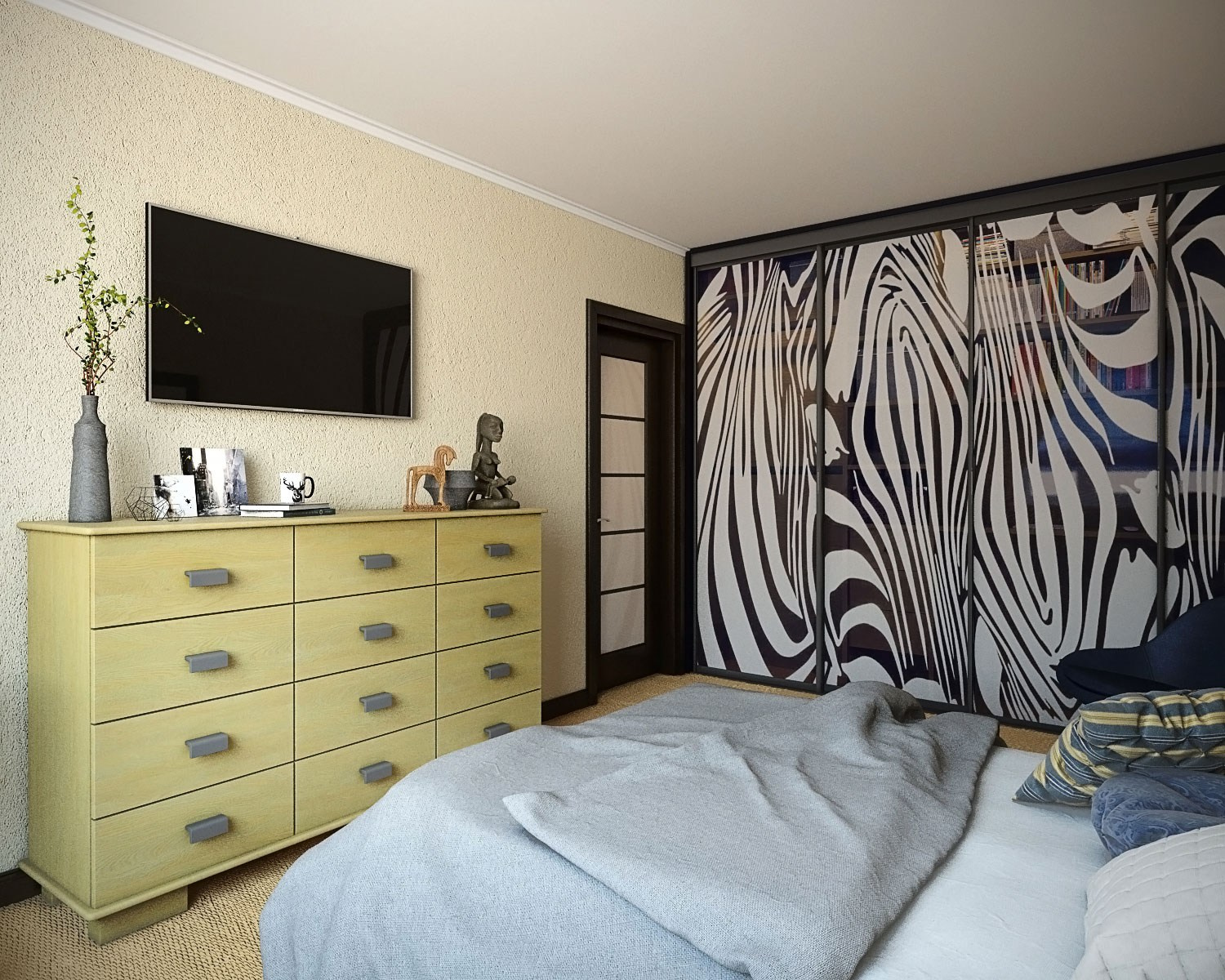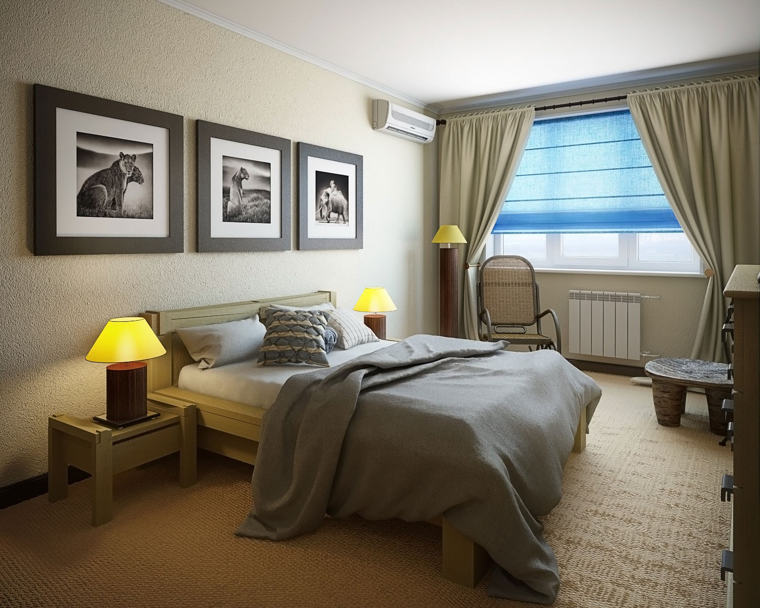 Бежевая природная цветовая гамма успокаивает и расслабляет. Чтобы интерьер не получился монотонным, мы добавили немного графики: рисунок зебры на шкафу, кованые элементы и большие картины над кроватью. Яркими акцентами стали желтые абажуры светильников и голубая римская штора.