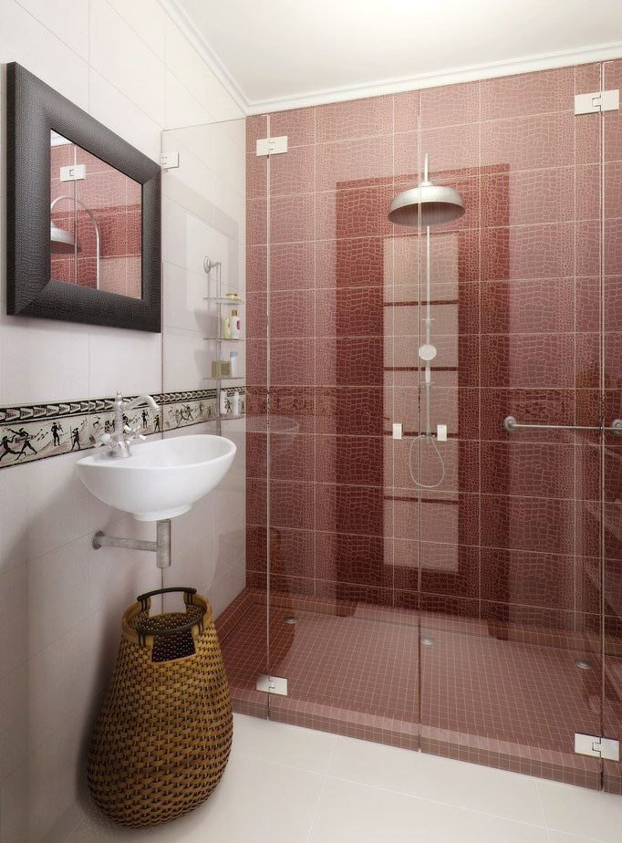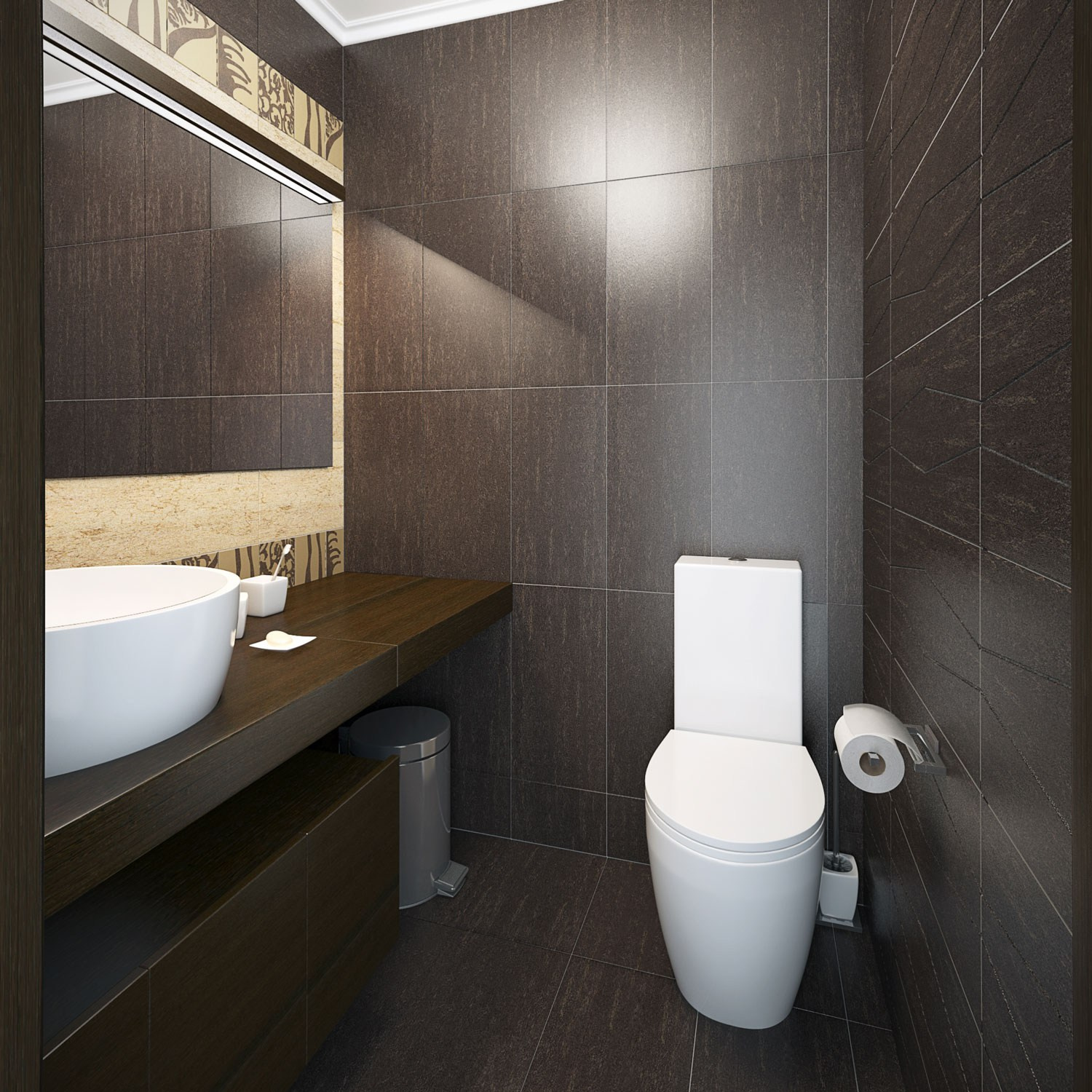 Ванная комната светлая с яркими акцентами. Необычная плитка «под кожу» и бордюр с этническим рисунком поддерживают общую идею дизайна в африканском стиле. Гостевой туалет получился более спокойный, в темных тонах с золотистыми вставками.