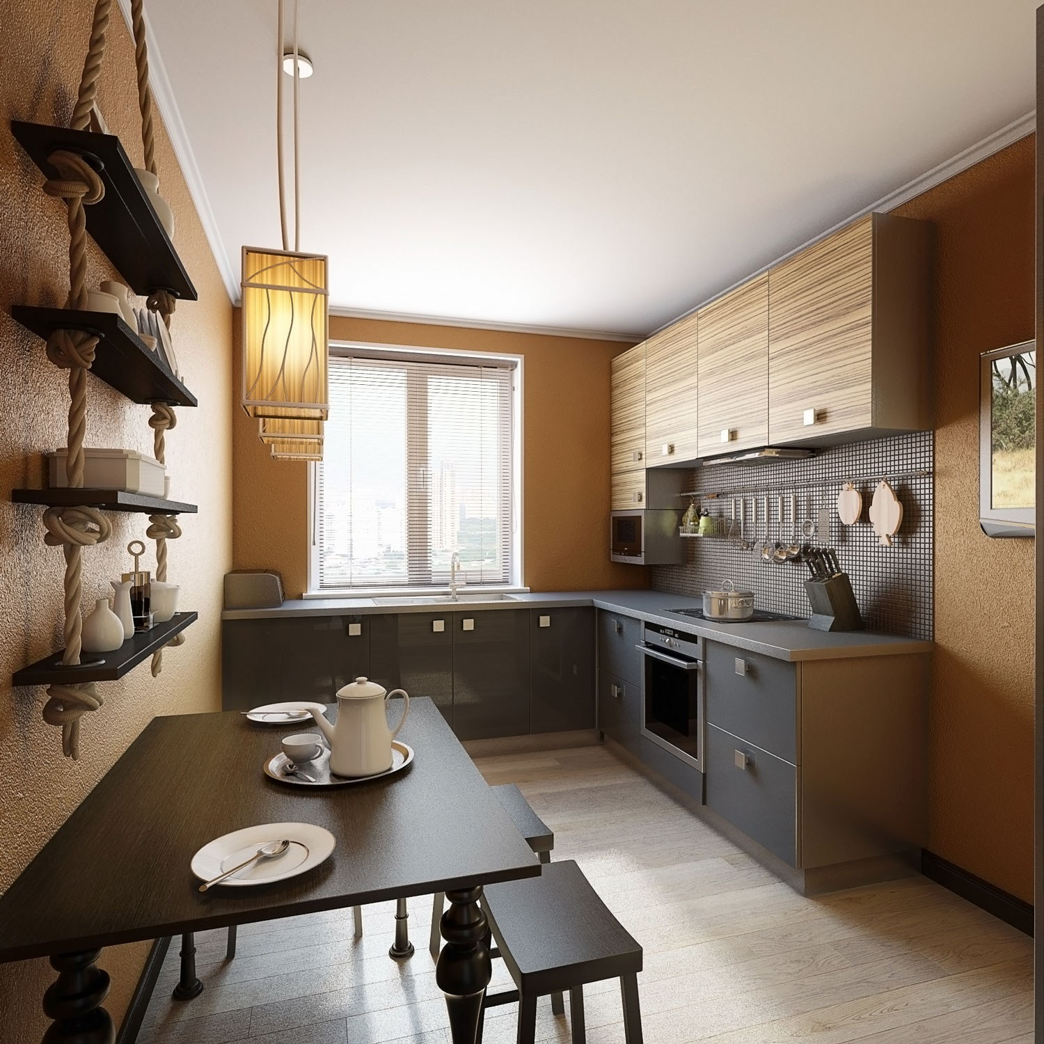 Для кухни мы использовали приглушенные оранжевые и шоколадные оттенки. Получилась комната цвета корицы — то что нужно для создания уютной атмосферы. Угловую кухню разместили вдоль окна, а при входе установили встроенный холодильник и вместительный пенал. Такое разделение корректирует вытянутые пропорции помещения, а за счет не занятого участка стены кухня воспринимается легче.