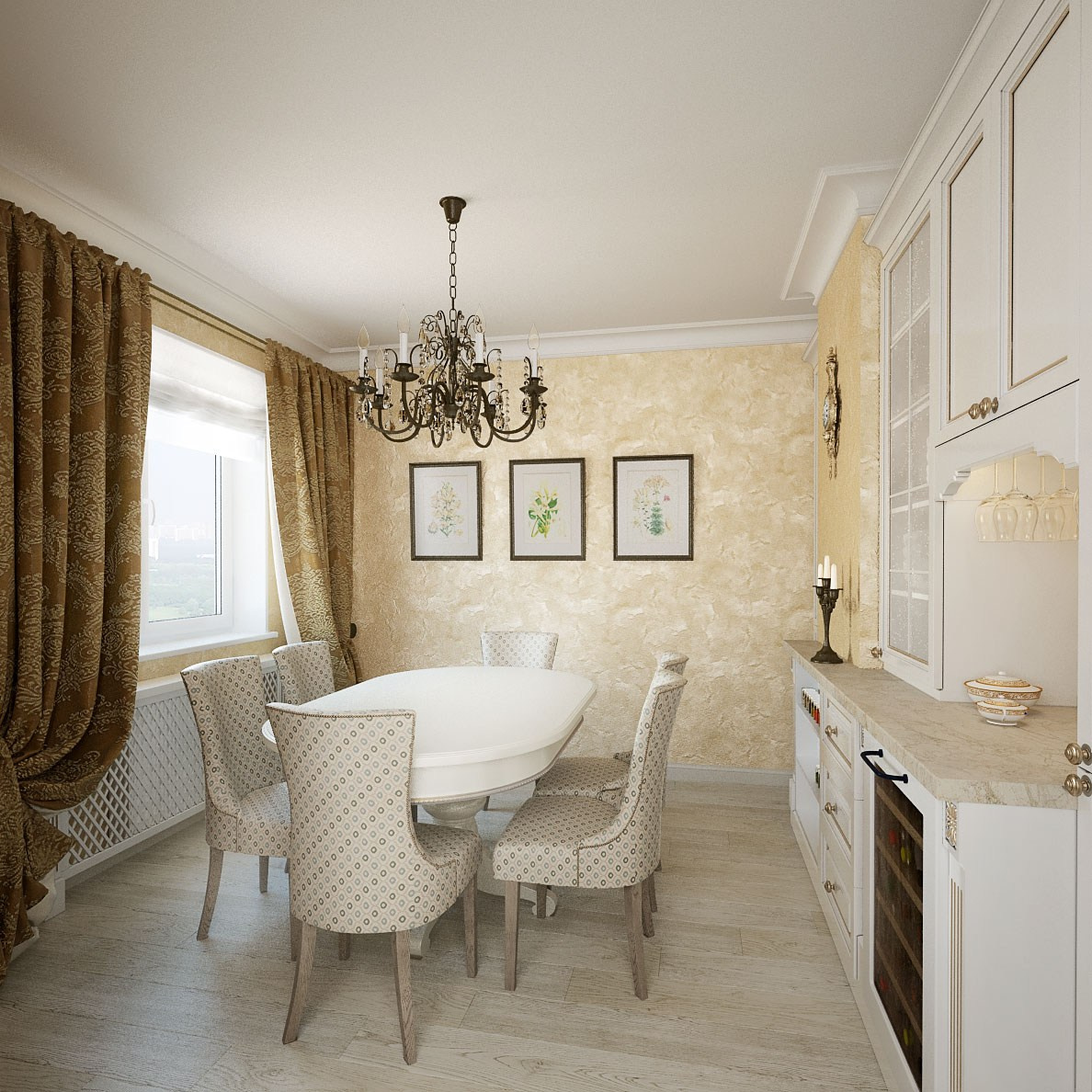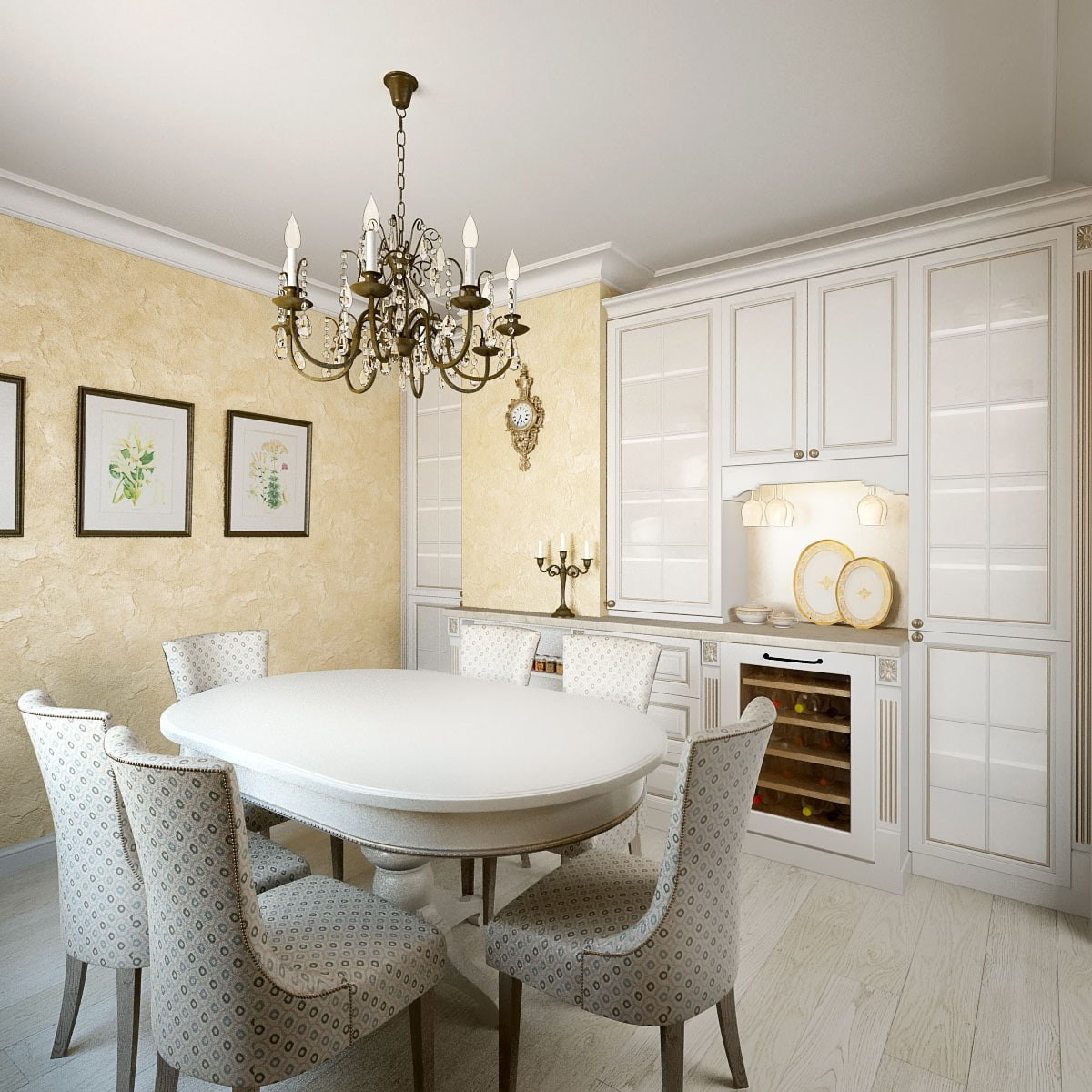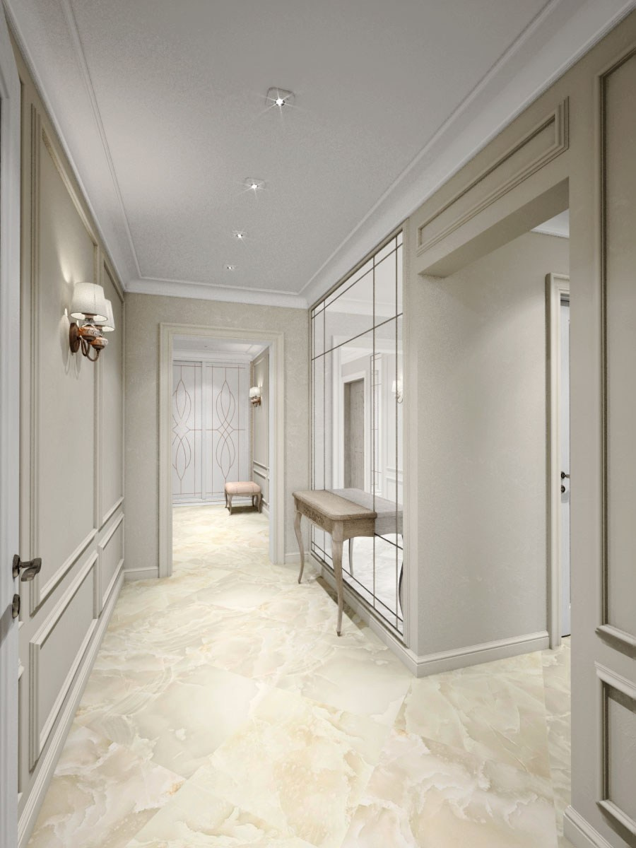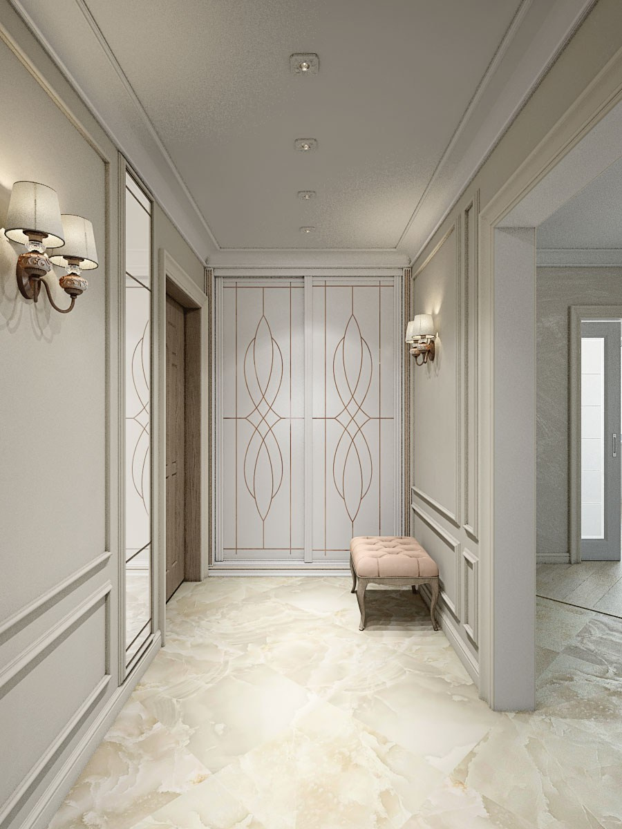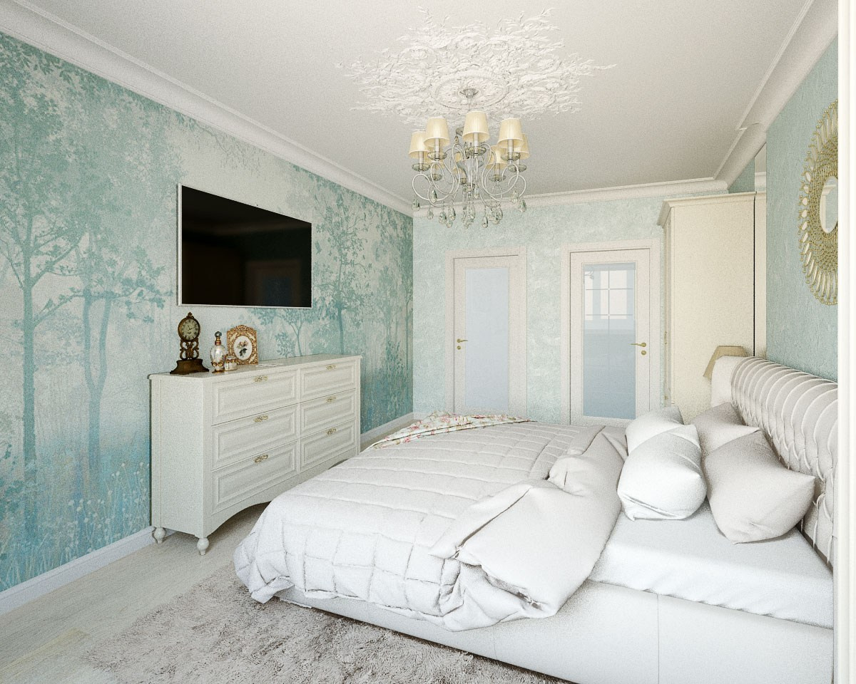 В этом интерьере мы использовали прием «цветные стены + светлая мебель». Цвета при этом брали пастельных оттенков, а мебель и декор — классической формы. Так и получилась та самая легкая классика, которую хотели наши клиенты. Дополнили молдингами и карнизами, а также использовали традиционные люстры и бра, чтобы собрать цельный образ.