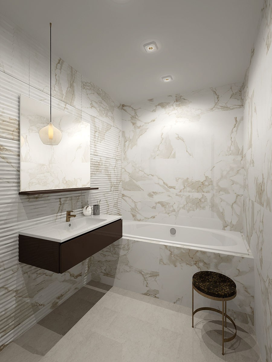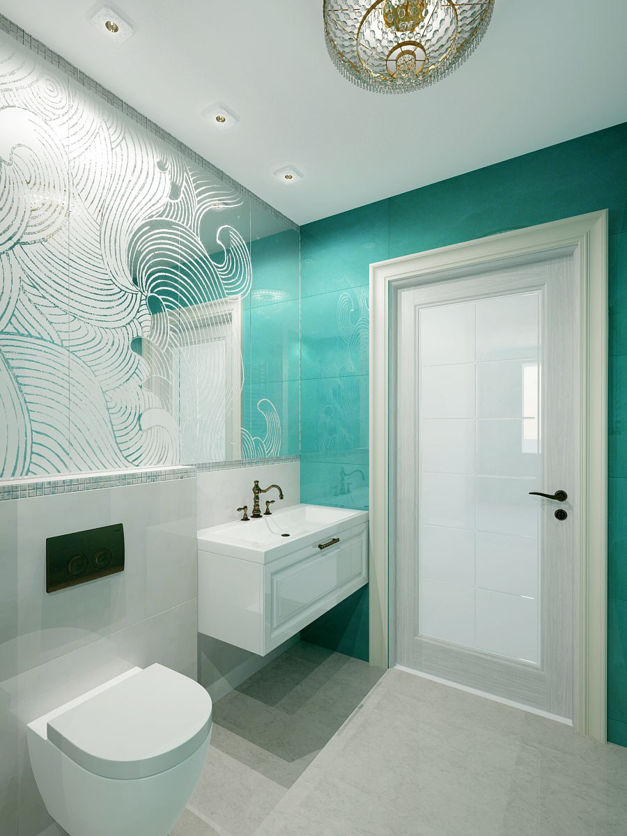 В квартире две ванные и они тоже разные. Общая ванная достаточно строгая, керамогранит под мрамор здесь сочетается с коричневыми фасадами мебели. А вот ванная при спальне наоборот яркая: бирюзовая плитка, мозаичное панно и орнамент на зеркале — все это заряжает бодростью и хорошим настроением на весь день.