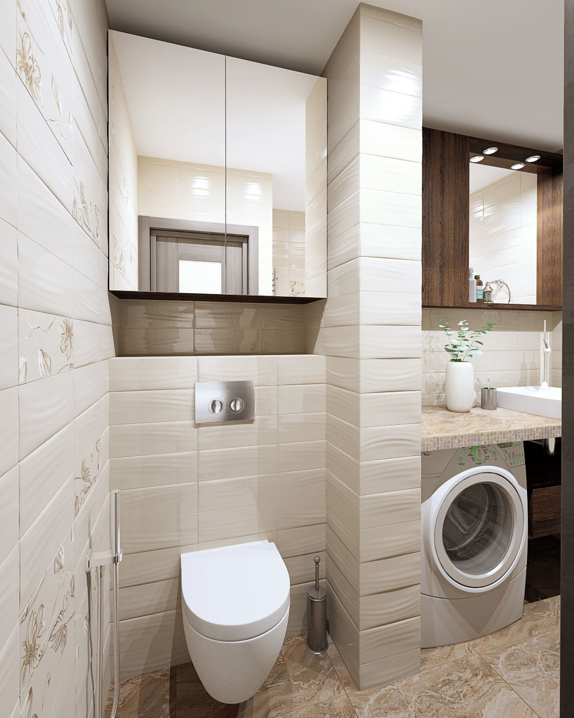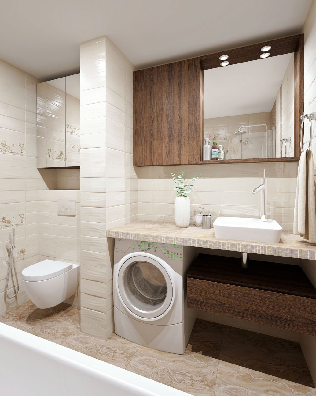 В процессе перепланировки площадь ванной увеличилась за счет прихожей. В новом помещении разместилась вся необходимая сантехника и предусмотрено место для стиральной машины. В функциональных шкафах над раковиной спрятаны бытовые принадлежности, а в зеркальном шкафу над унитазом скрыт водонагреватель.
