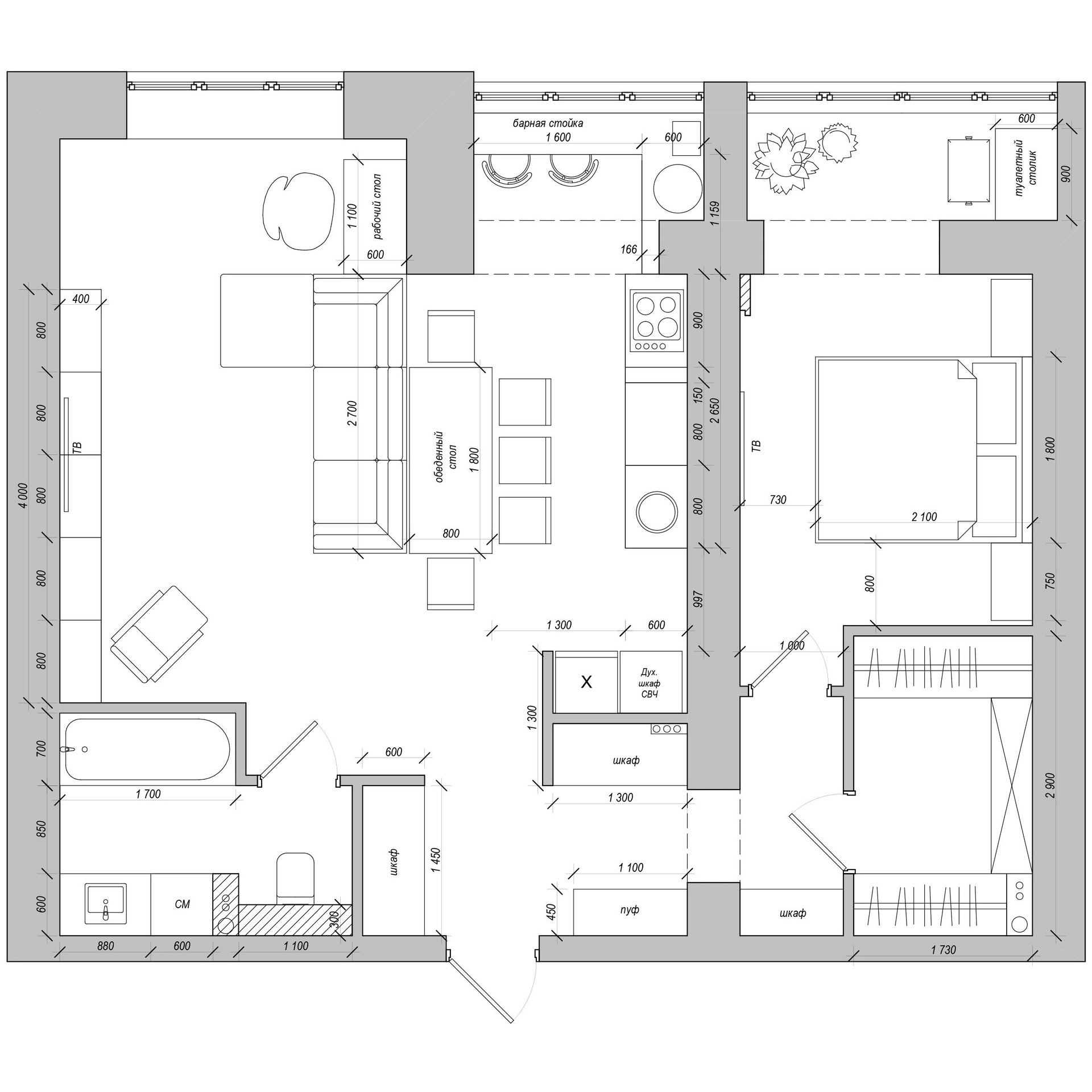 Чтобы добавить функциональности исходному пространству было решено немного изменить планировку. Квартира поделилась на общую и приватную зоны. В общей зоне убрали перегородку между кухней и гостиной, присоединили лоджию. Объединенное пространство получилось просторным, светлым и функциональным. Из квартиры открывается прекрасный вид на лес и город, мы подчеркнули это, установив панорамные окна в гостиной и спальне.