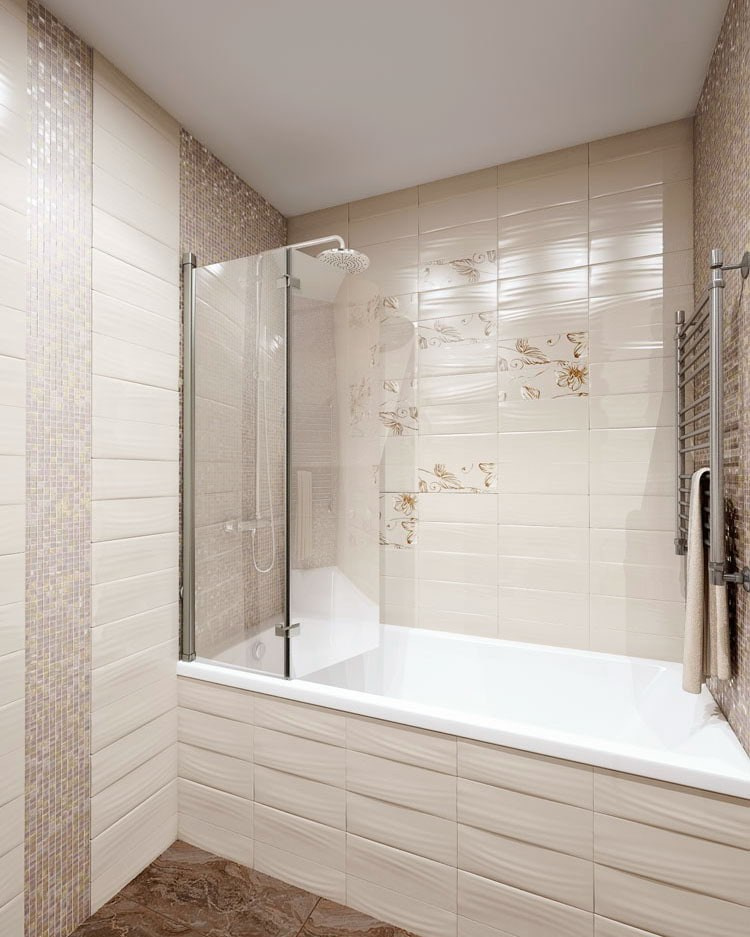 Клиенты хотели спокойный дизайн, но обязательно с интересными деталями. Очень понравилась плитка с фактурным волнистым рисунком и именно она легла в основу отделки ванной комнаты. Мы дополнили ее вставками из мозаики и цветочным декором из той же коллекции.