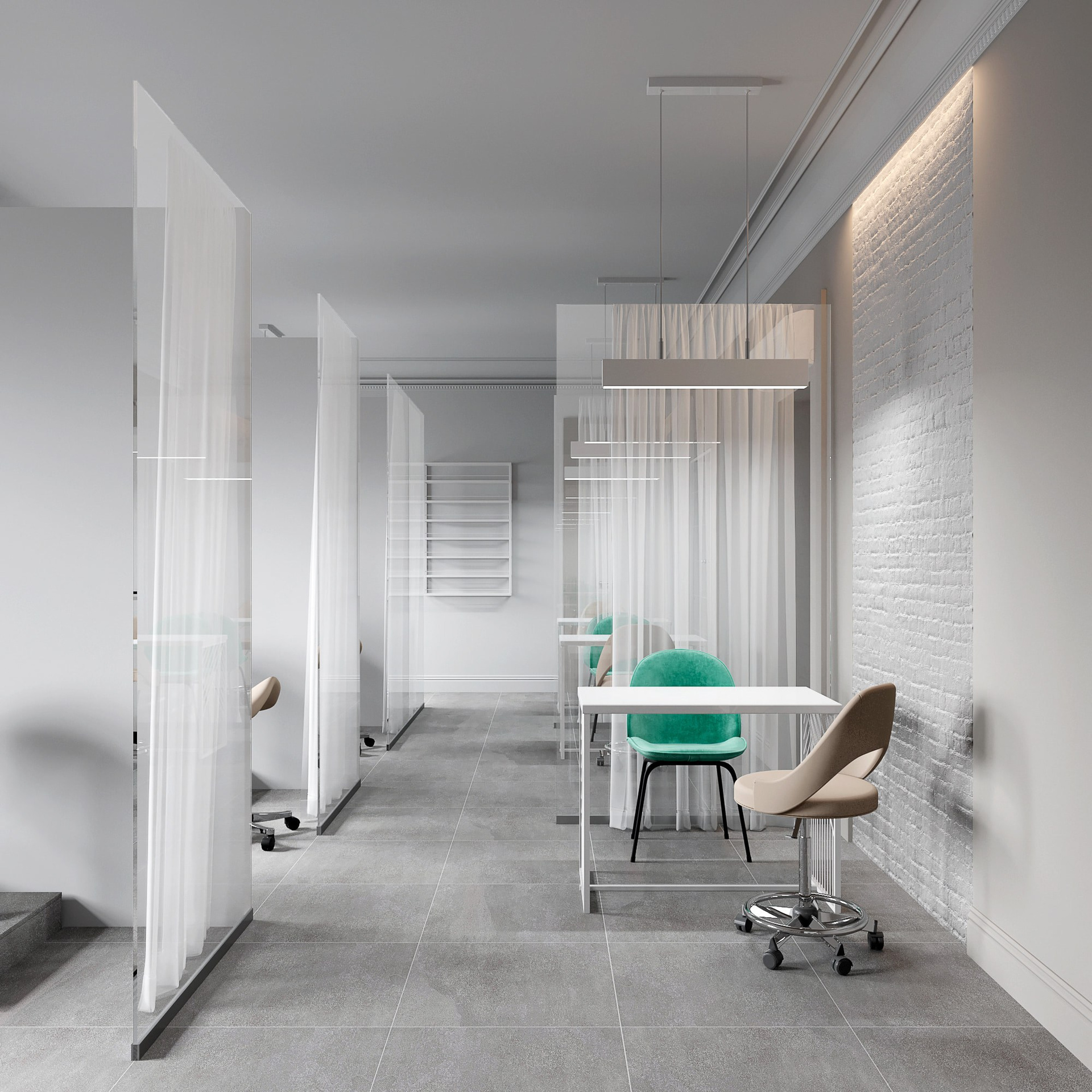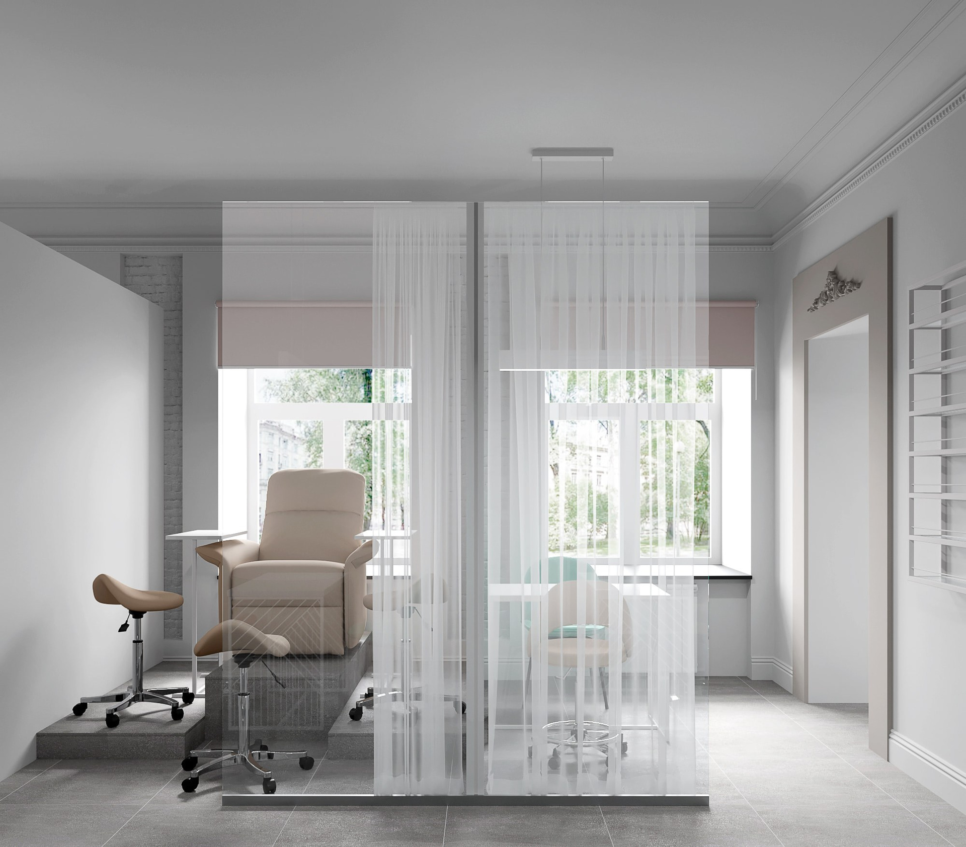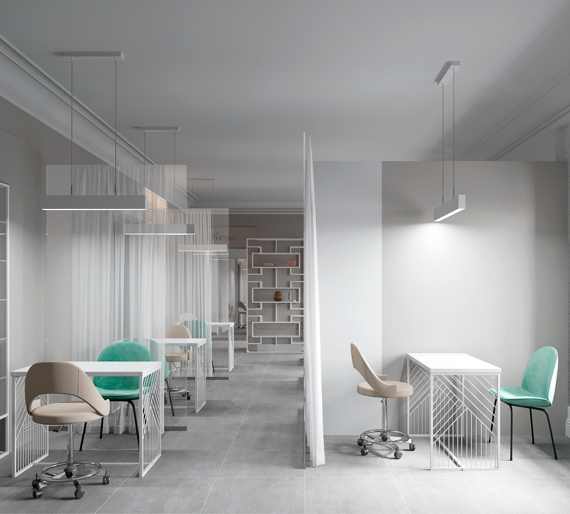 Основной зал мы поделили на небольшие условные кабинки под маникюр и педикюр. Разделением этих «кабинок» служат стеклянные перегородки и легкий воздушный тюль.