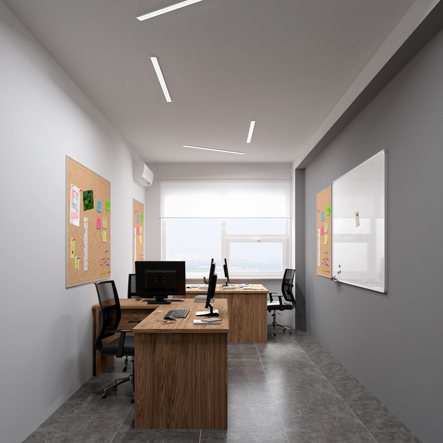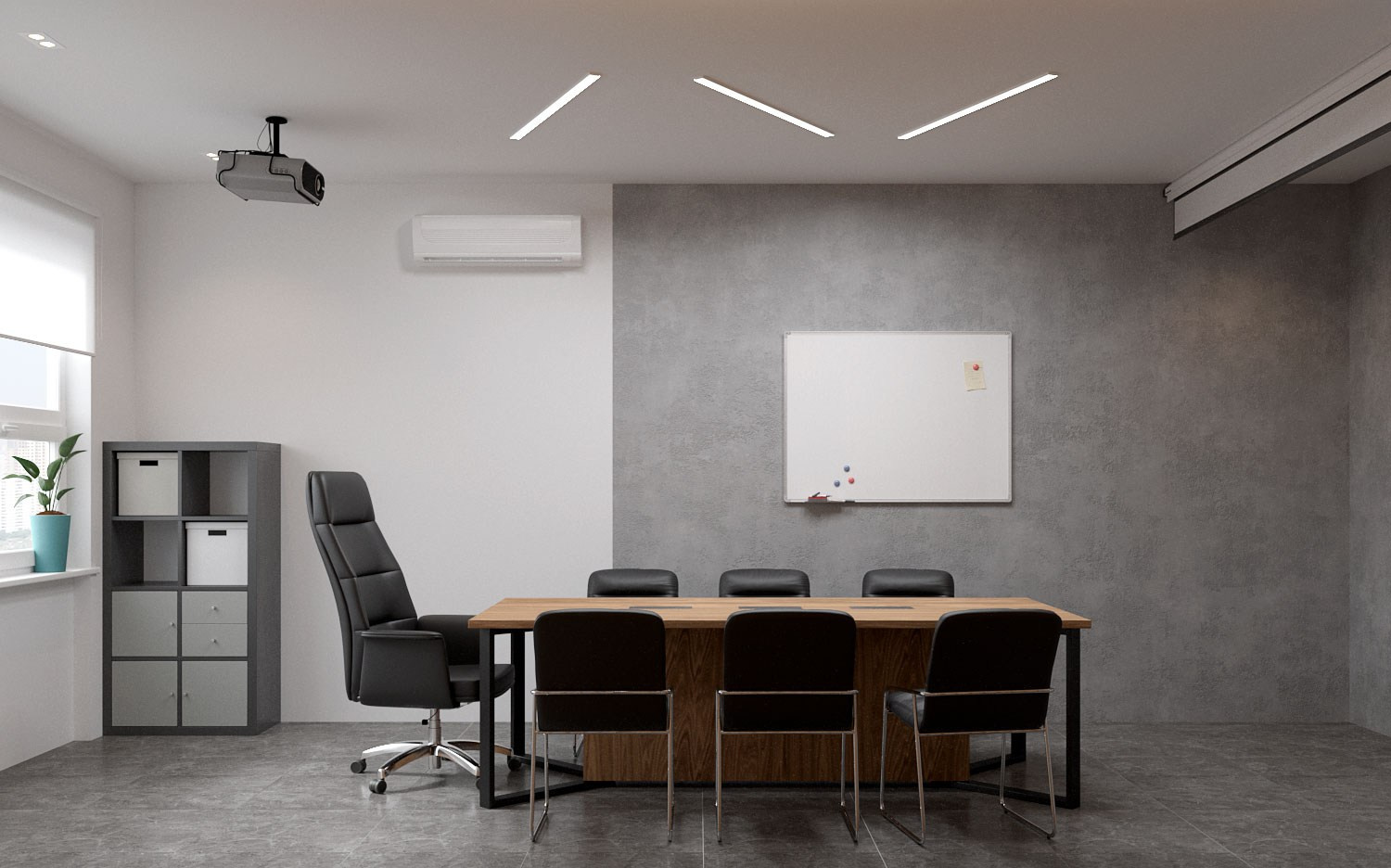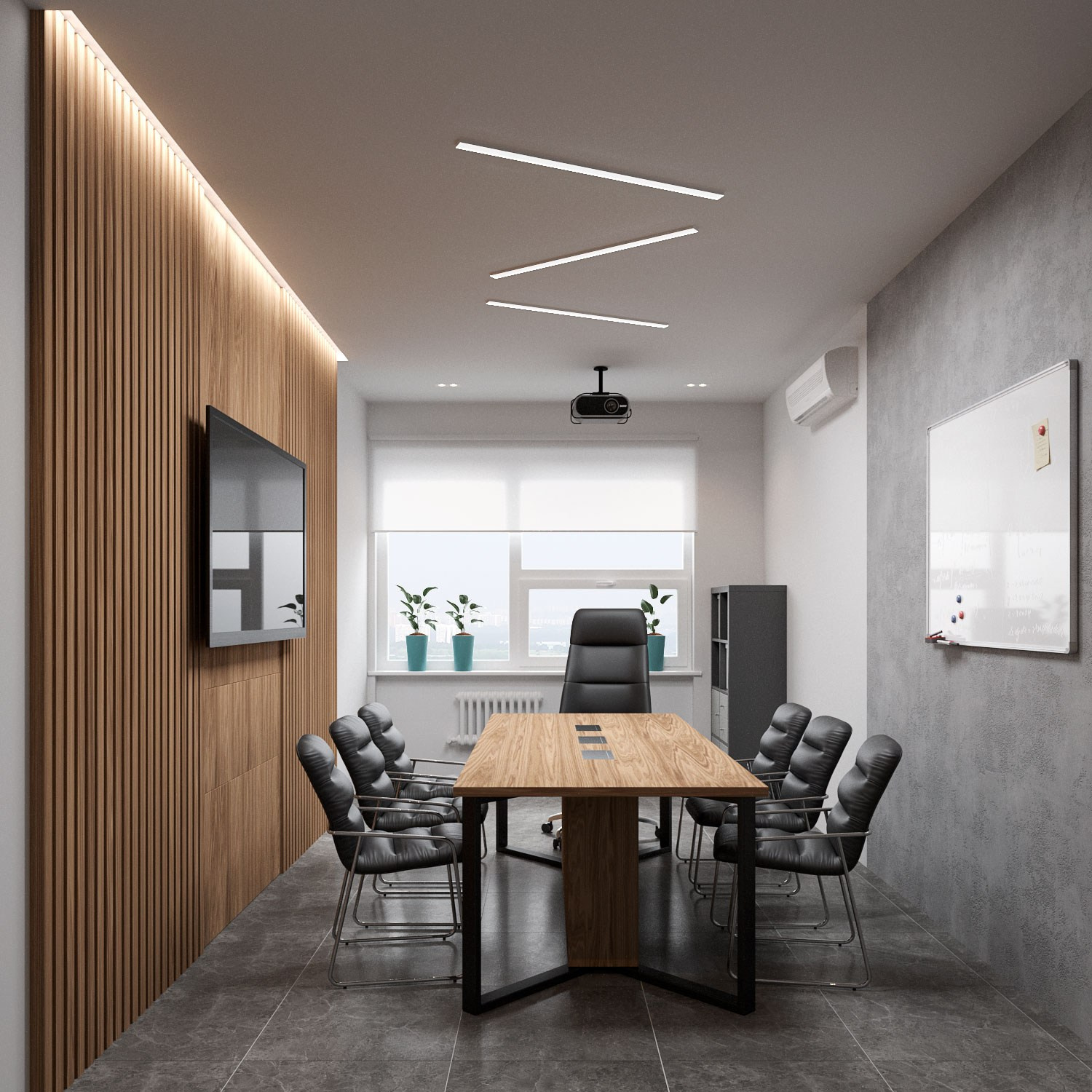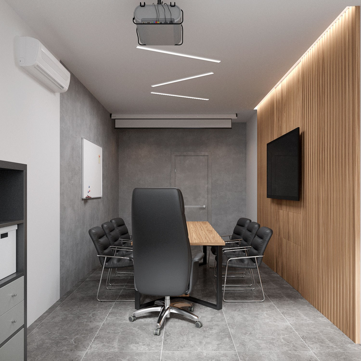 Этот проект мы делали для одного из заводов г. Саратова. Было необходимо разработать типовое универсальное офисное пространство и переговорную комнату, разместить проектор и все необходимое оборудование.