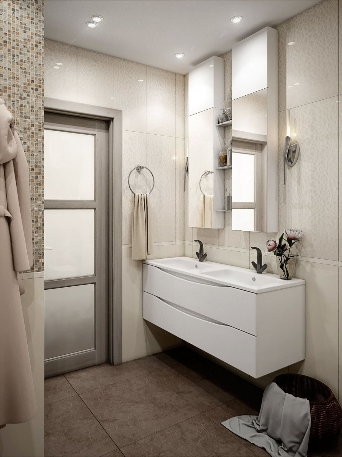 Для удобства хозяев поставили большую двойную раковину, в нишу встроили шкаф, а над ванной устроили несколько открытых полок с подсветкой.