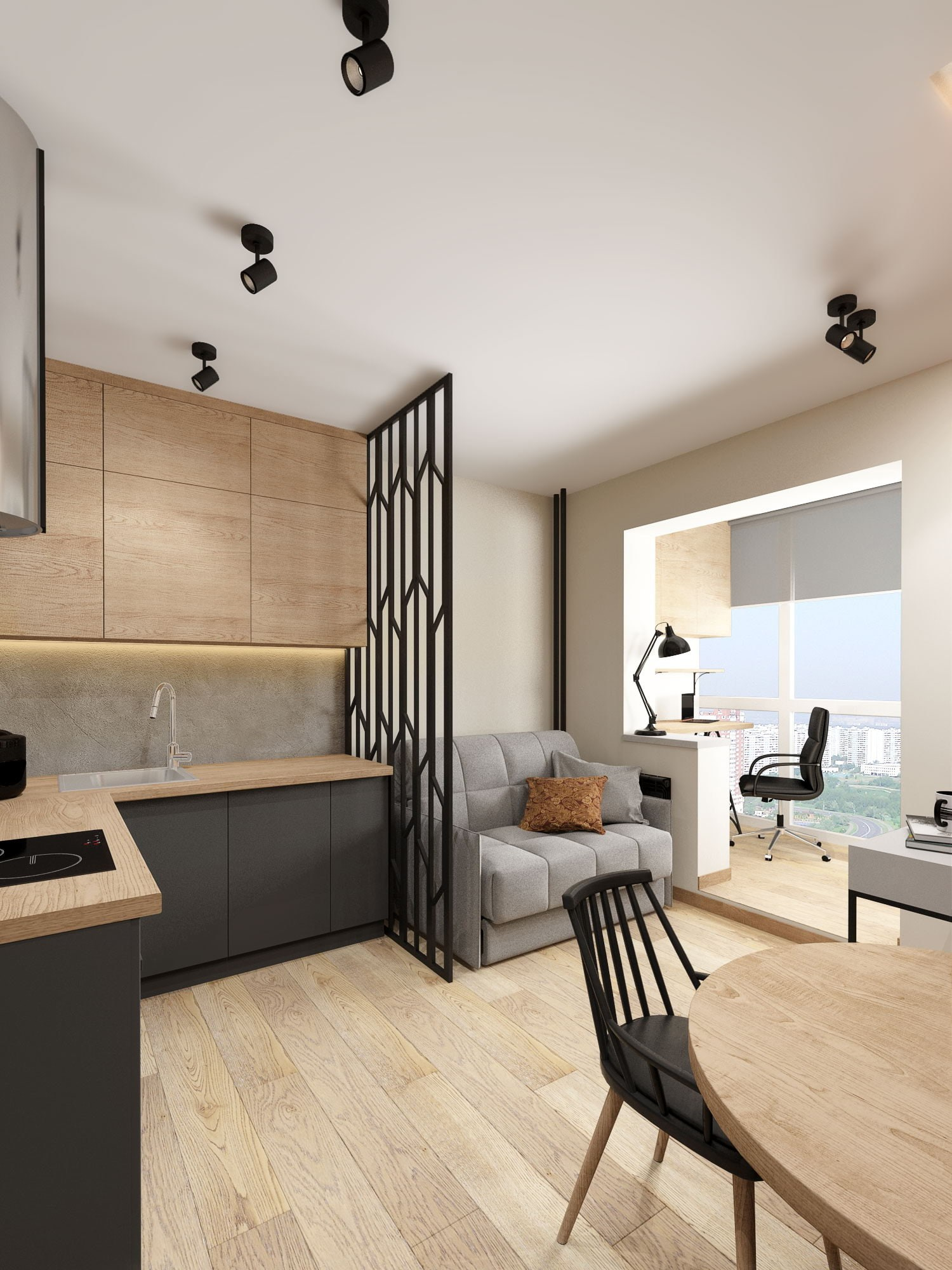Мы постарались выжать максимум из каждого квадратного метра: присоединили и утеплили лоджию, выделили место под гардеробную, а также превратили кухню в многофункциональное пространство с столовой, рабочим кабинетом и небольшим раскладным диваном.