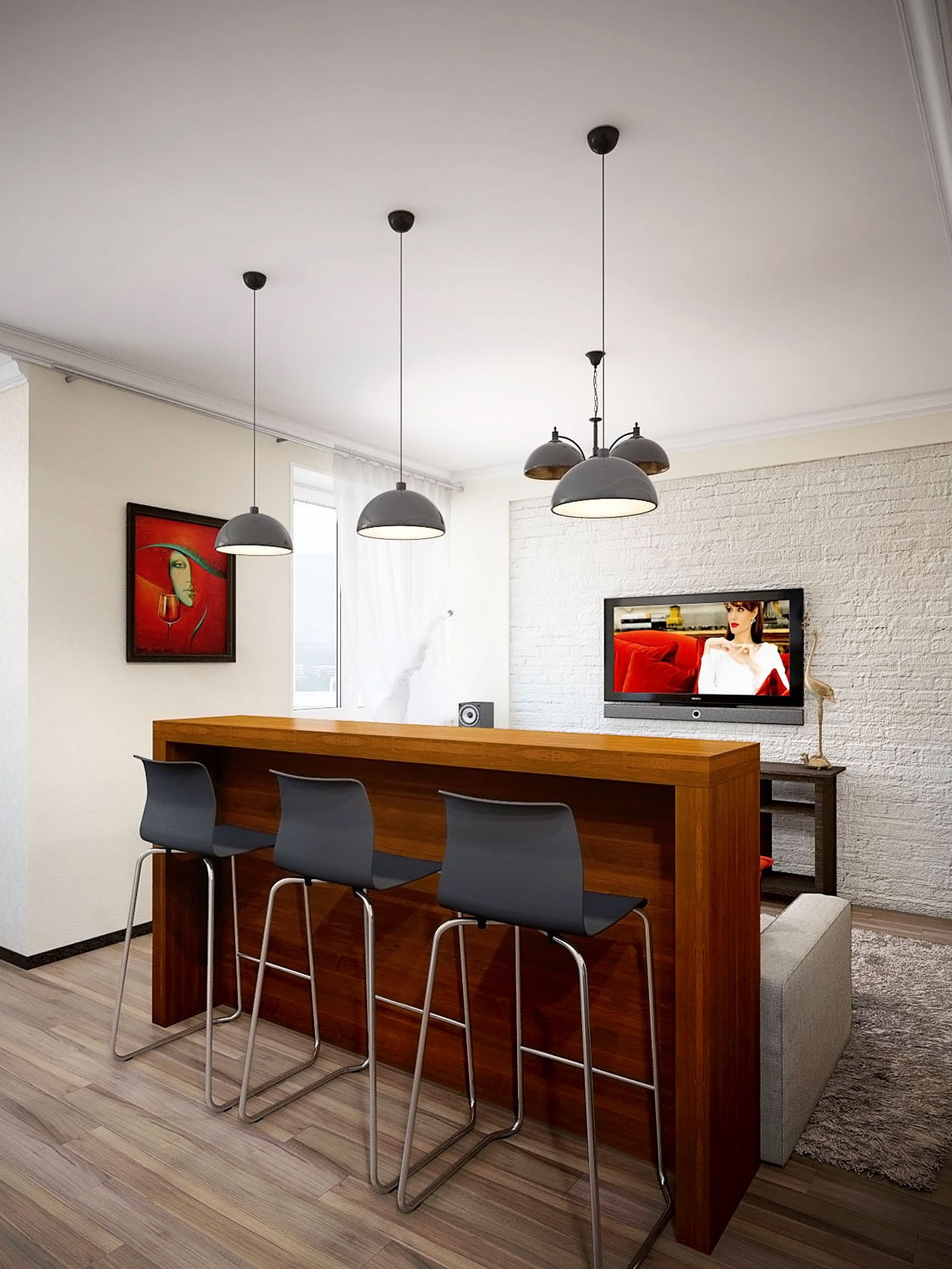 Остальная часть квартиры поделилась на кухонную зону и зону гостиной, которые условно разделены барной стойкой. На лоджии организовали рабочий кабинет.
