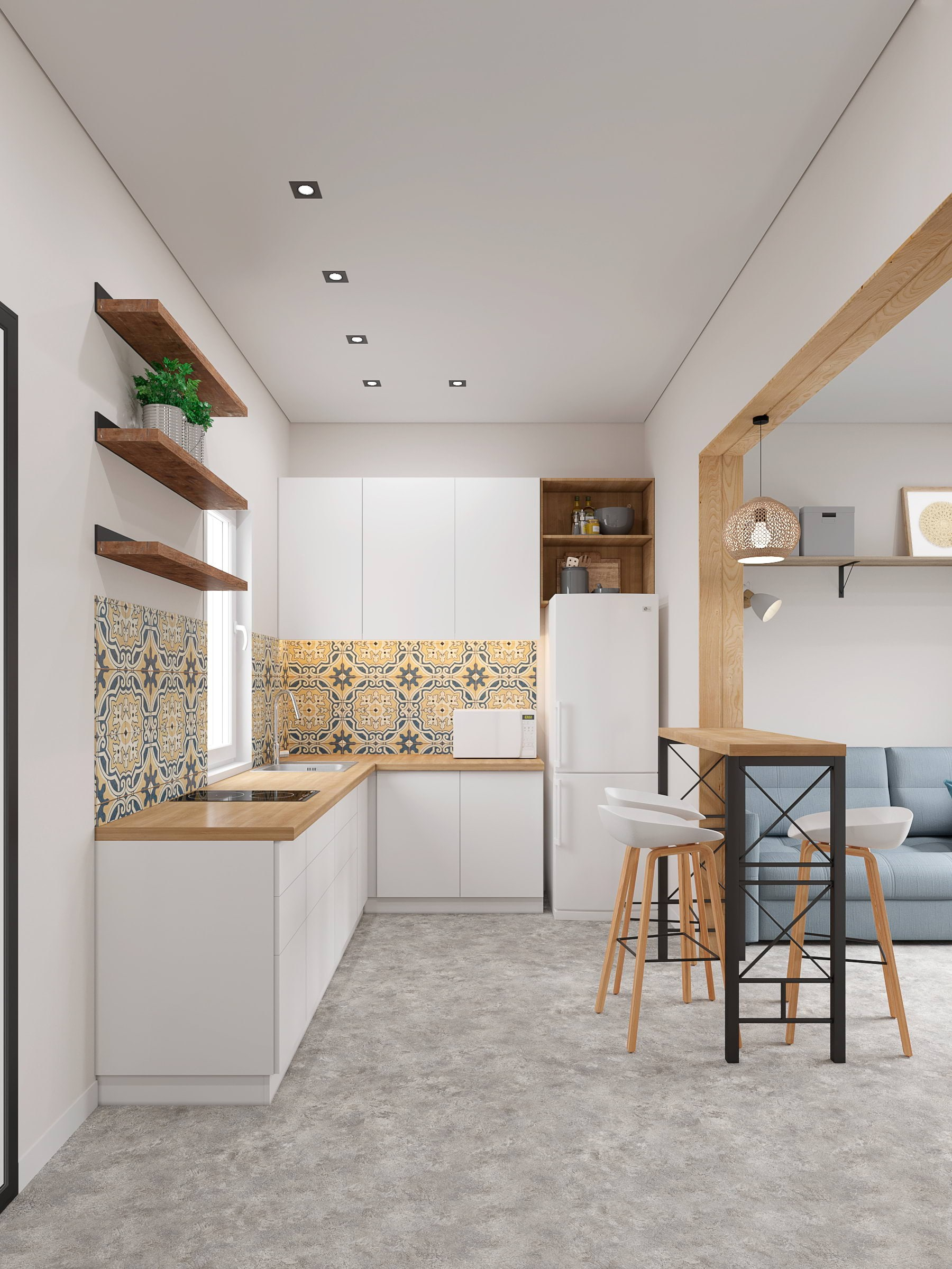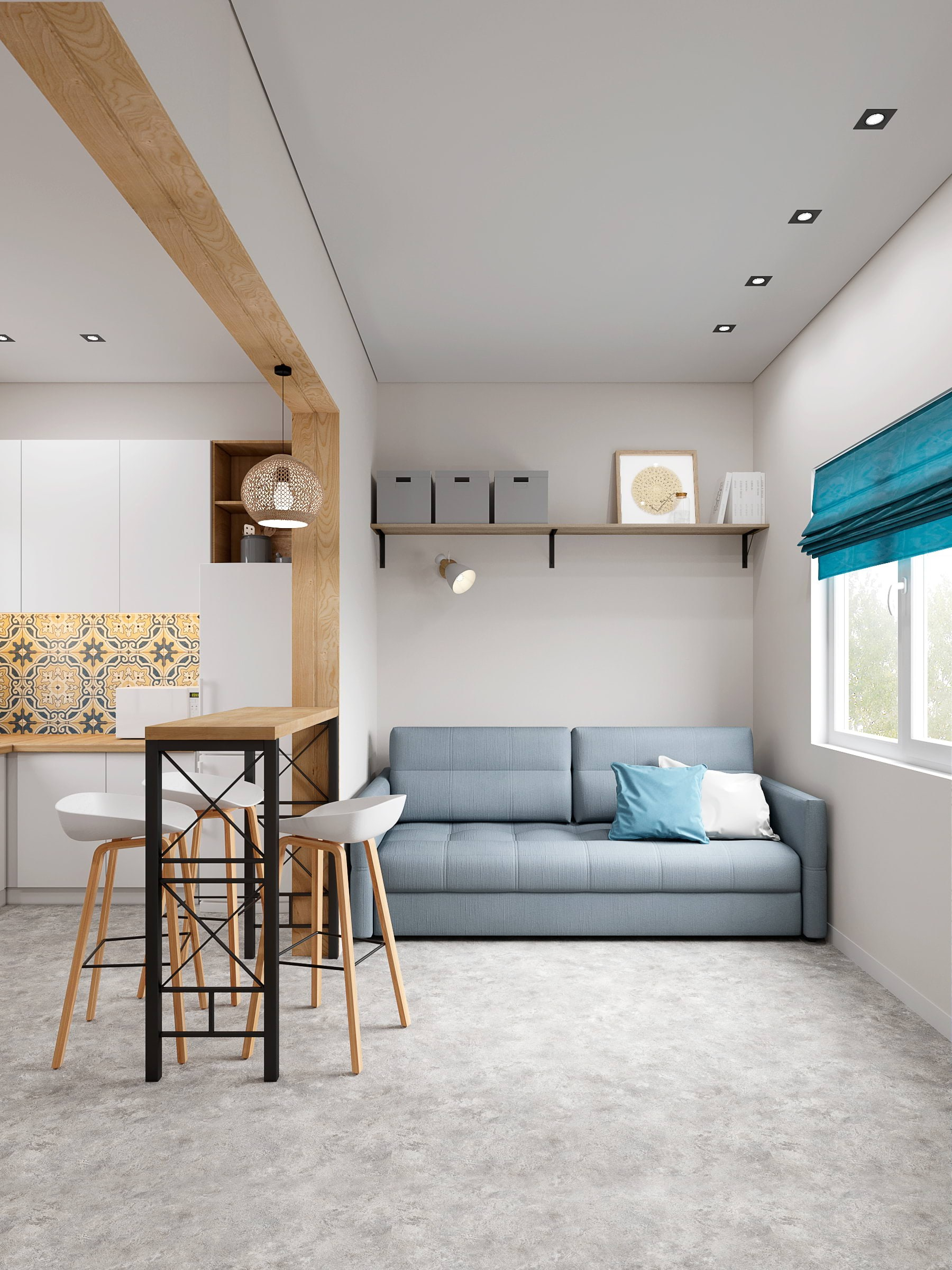 На полу — линолеум под бетон, потолок — натяжной с встроенными светильниками, которые дают приятное мягкое рассеянное освещение. В качестве акцента — яркие диваны и кухонный фартук из плитки Cersanit Sevilla Печворк.