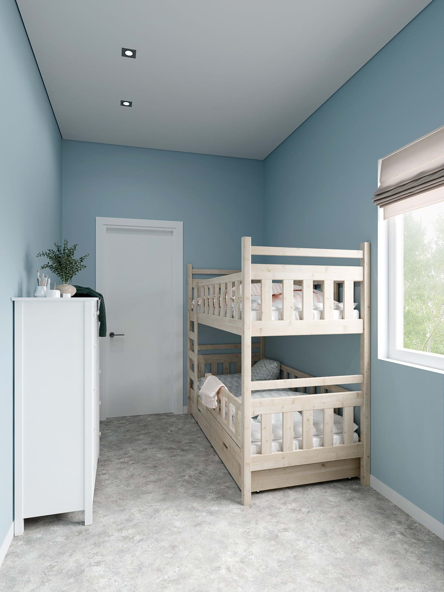 В качестве отделки стен мы использовали обои под покраску, молочный цвет для гостиной зоны, серый и голубой для спален. Наши небольшие помещения получились легкими и воздушными.