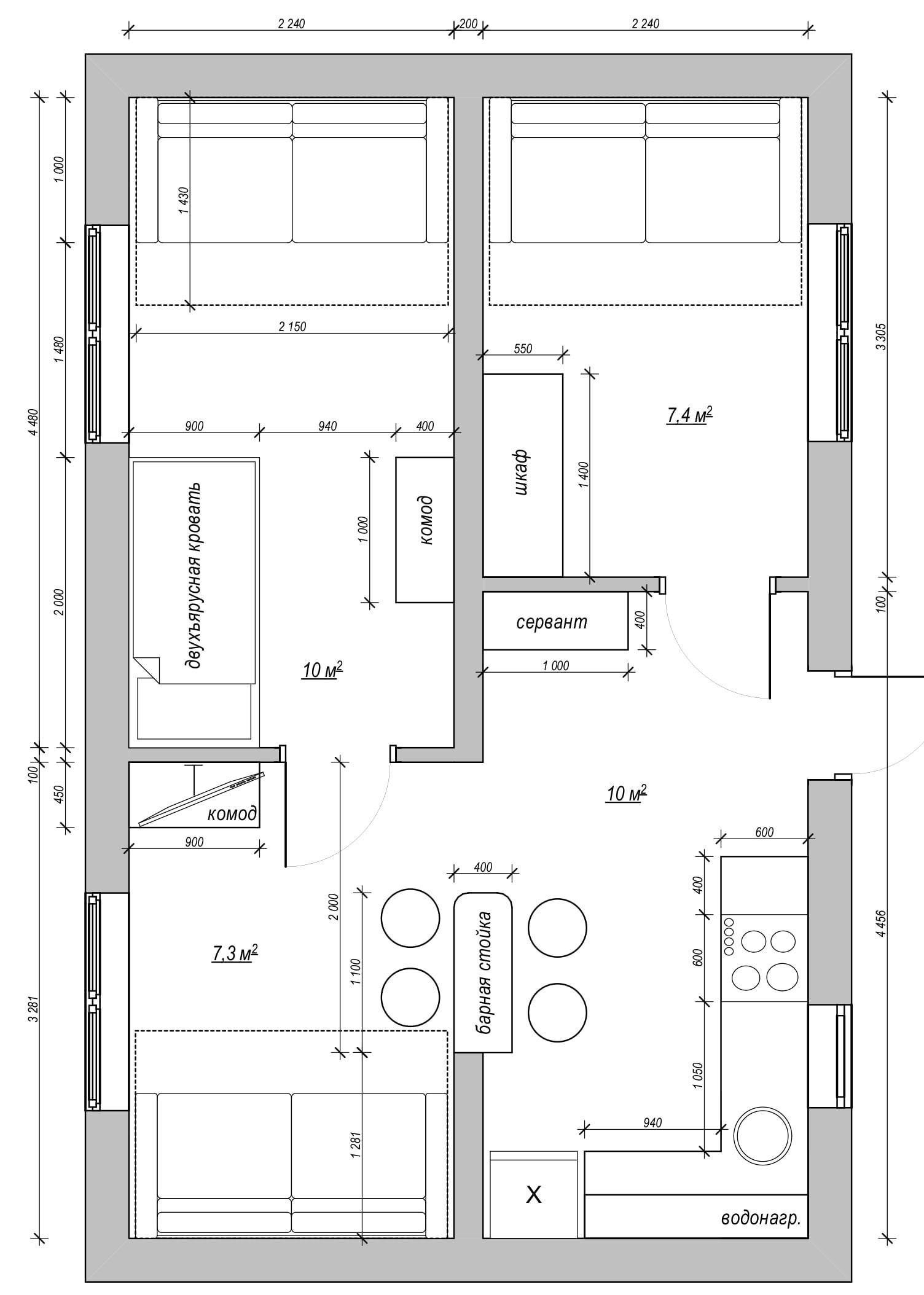 Поставили три раскладных дивана и двухъярусную кровать для детей, не забыли и про места для хранения в виде двух вместительных шкафов и комода.