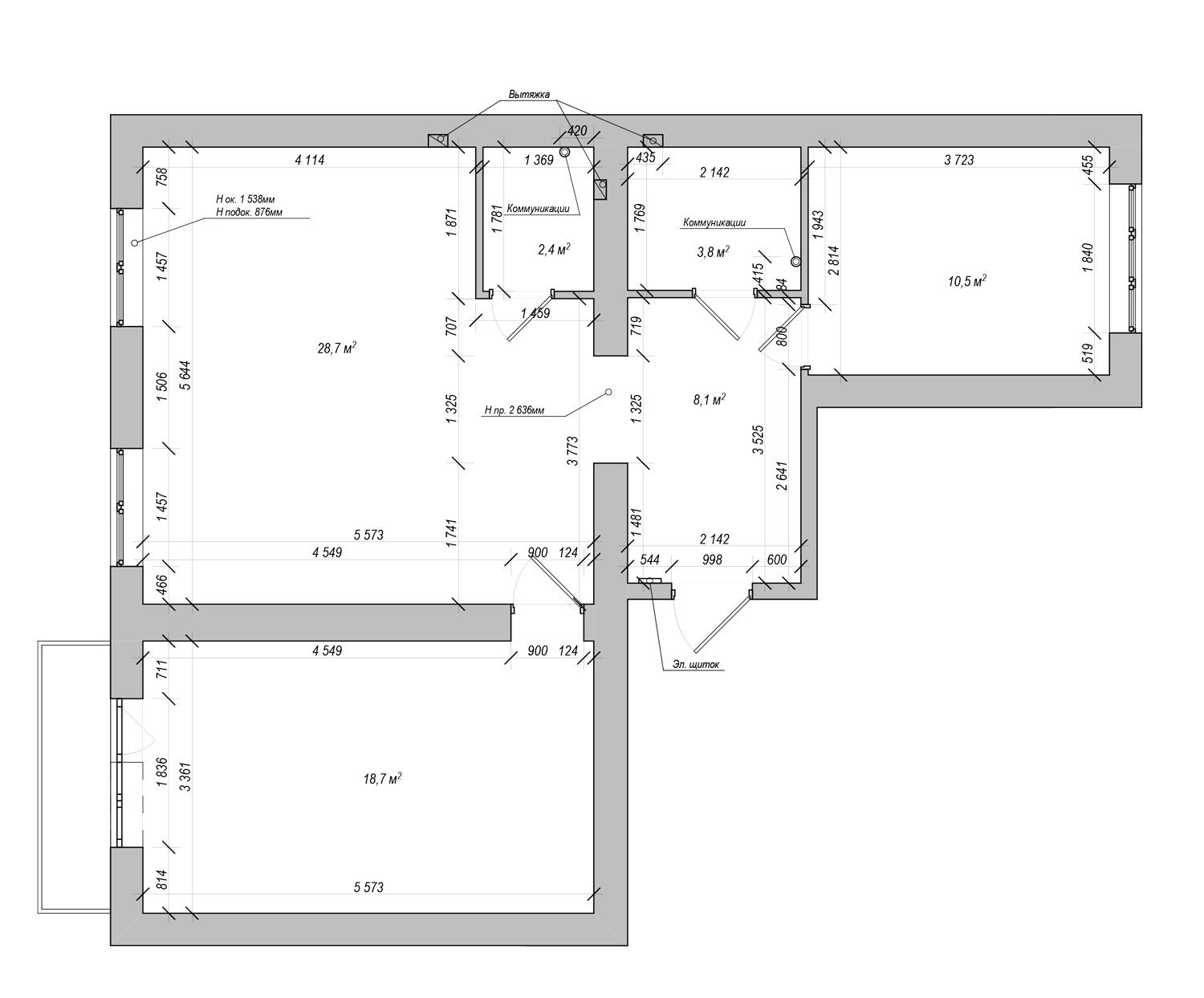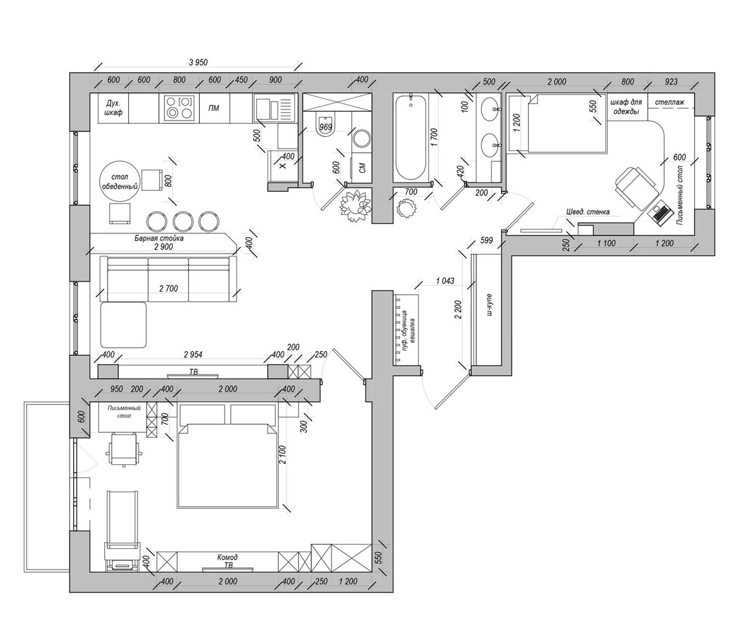 Планировка квартиры уже изначально была достаточно удобной и вполне подходила под наши задачи, поэтому стены и перегородки решили не трогать. Мы предложили несколько вариантов расстановки мебели и организации функциональных зон и в итоге был выбран самый оптимальный вариант.