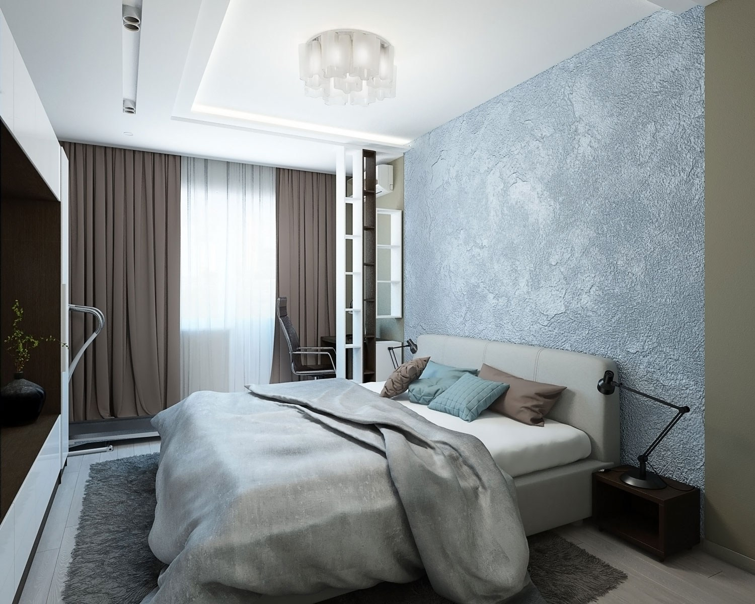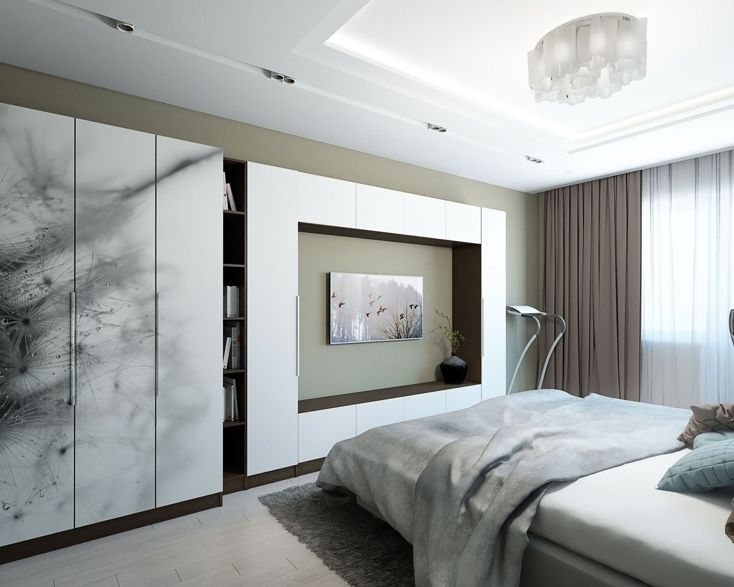 Сложная цветовая гамма на основе оливкового и голубого поддерживает общую идею интерьера, а изюминкой спальни стало черно-белое фото одуванчика, напечатанное на фасадах шкафа.