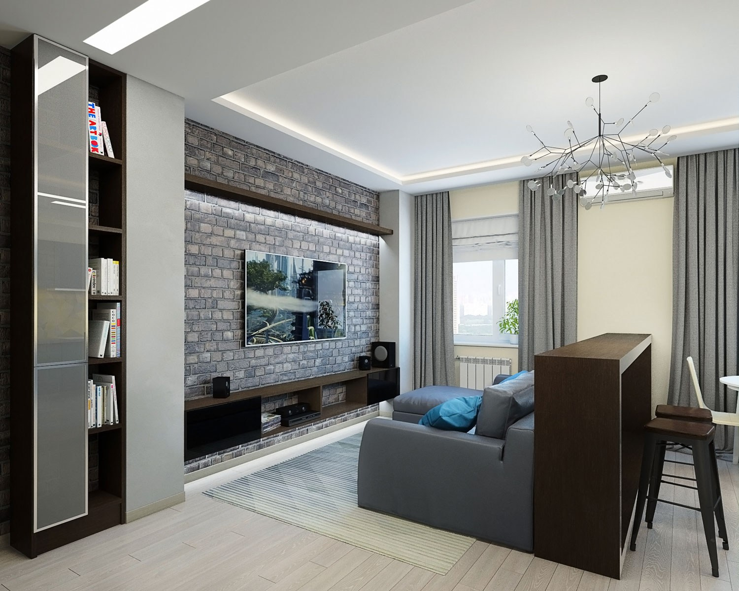 В основе этого интерьера лежит современный стиль, с его простыми и понятными линиями и формами. Элементы лофта лишь немного проскальзывают в виде кирпичной кладки на стенах и имитации бетонных балок и колонн.