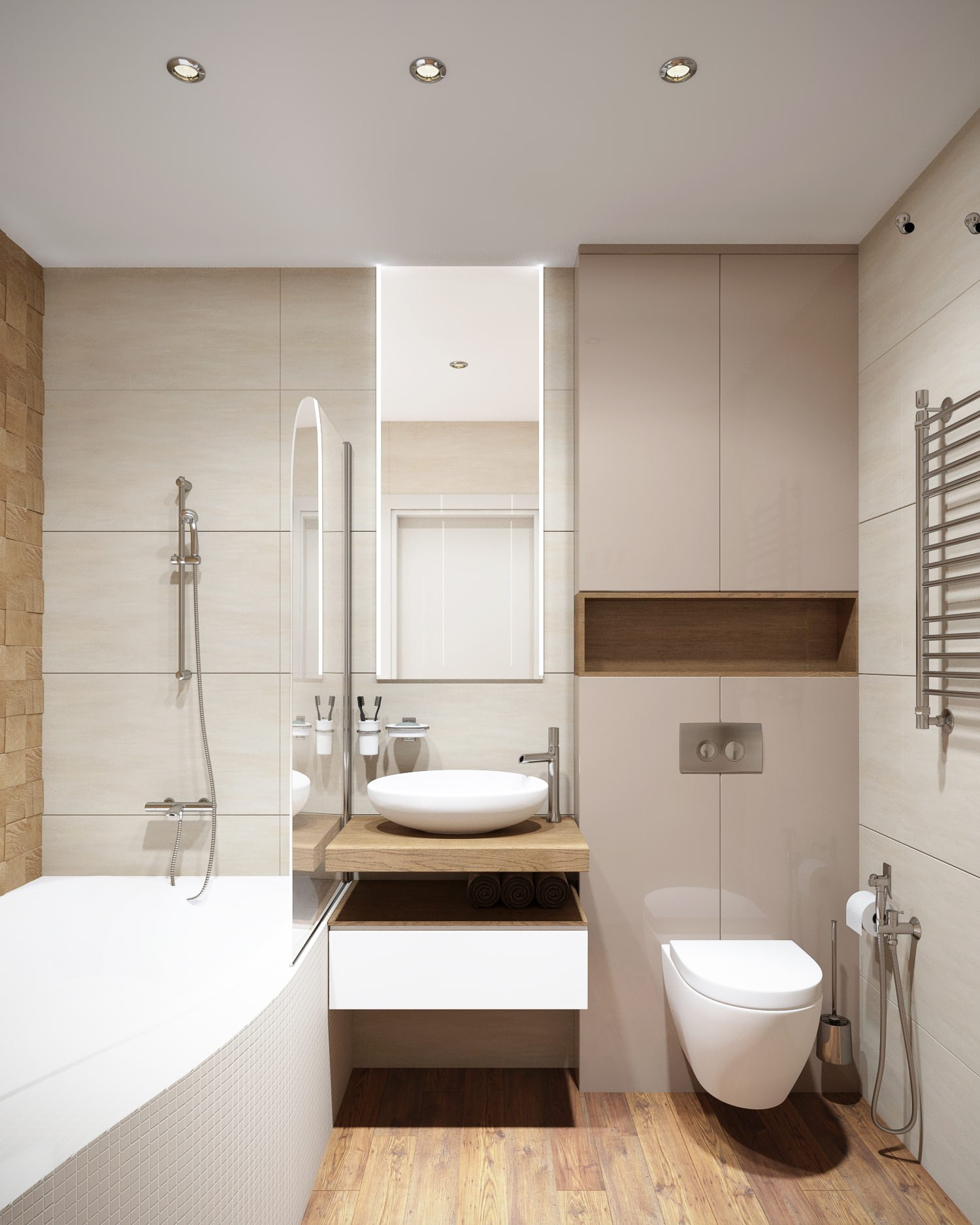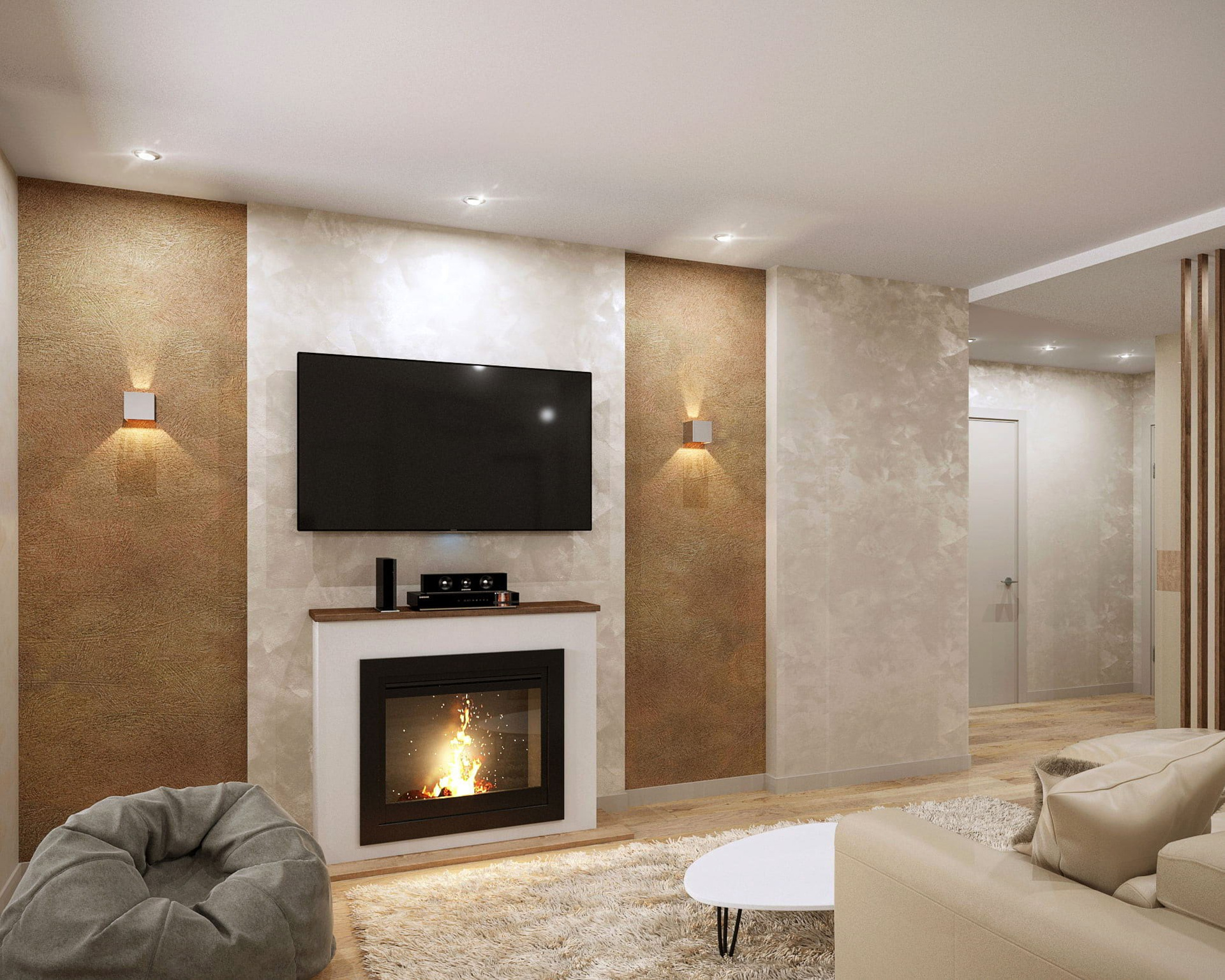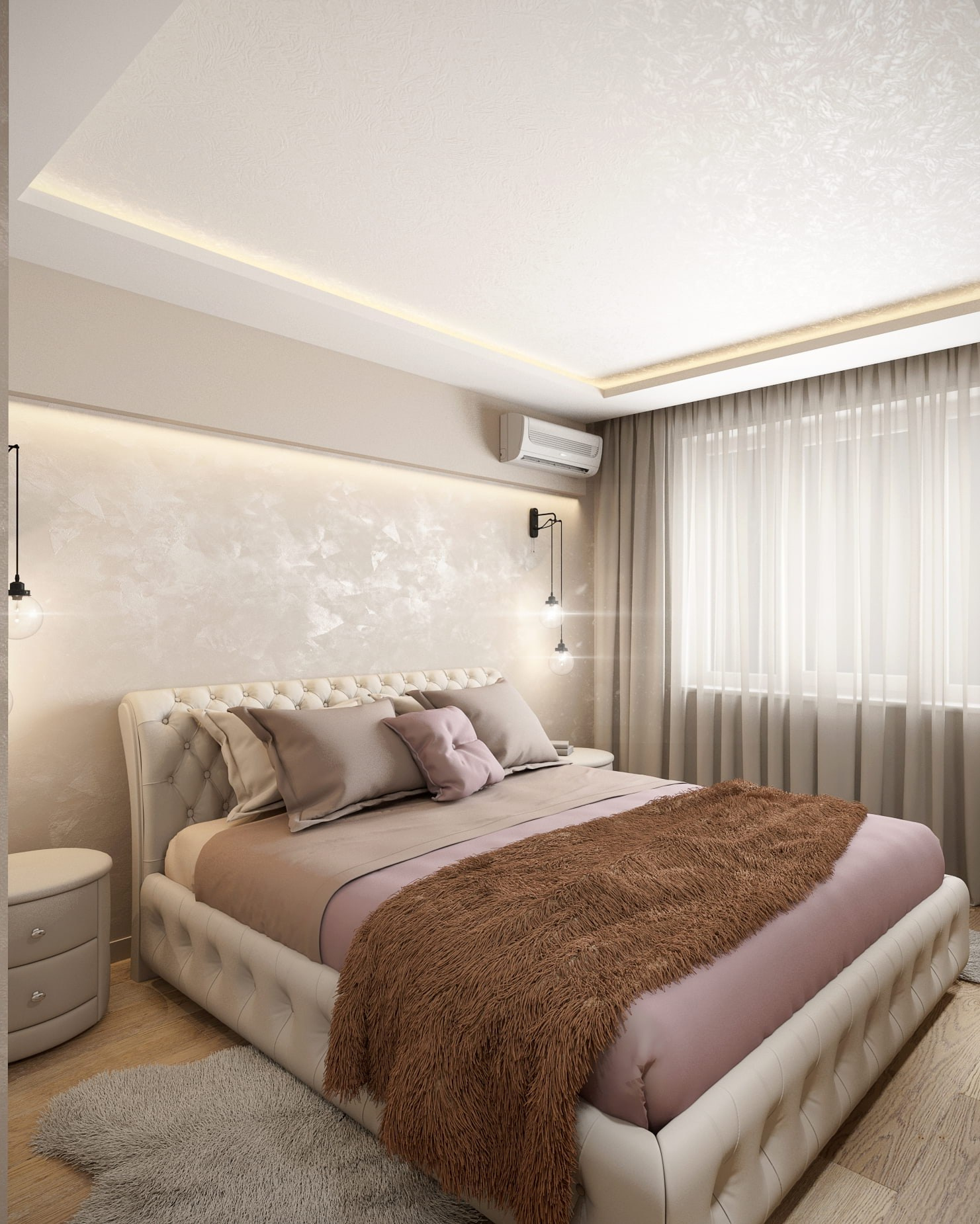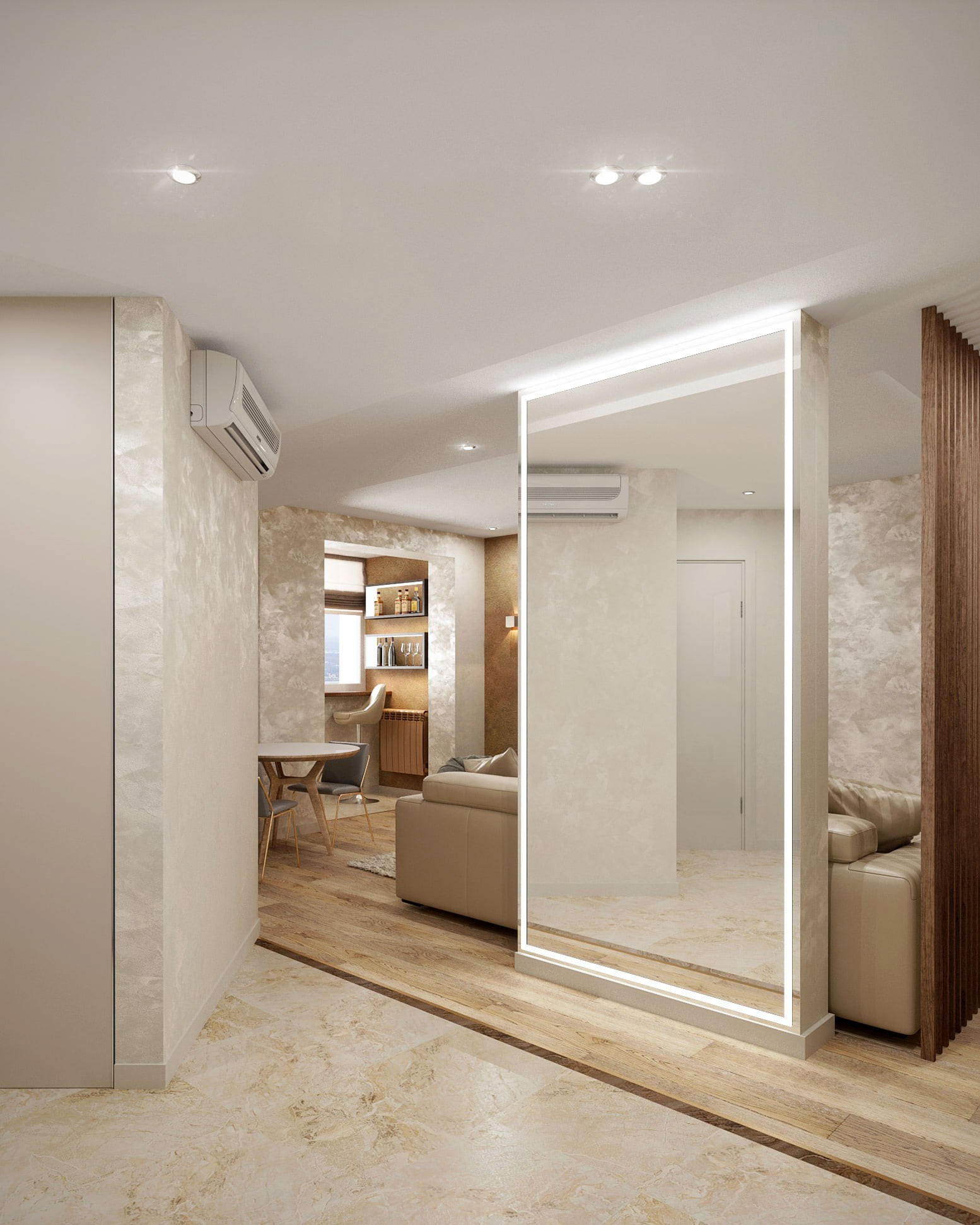 Разные функциональные элементы объединены единой цветовой гаммой. Дополняет интерьер продуманное многоуровневое освещение, а декоративная шелковая штукатурка дает красивые блики и добавляет еще больше света.