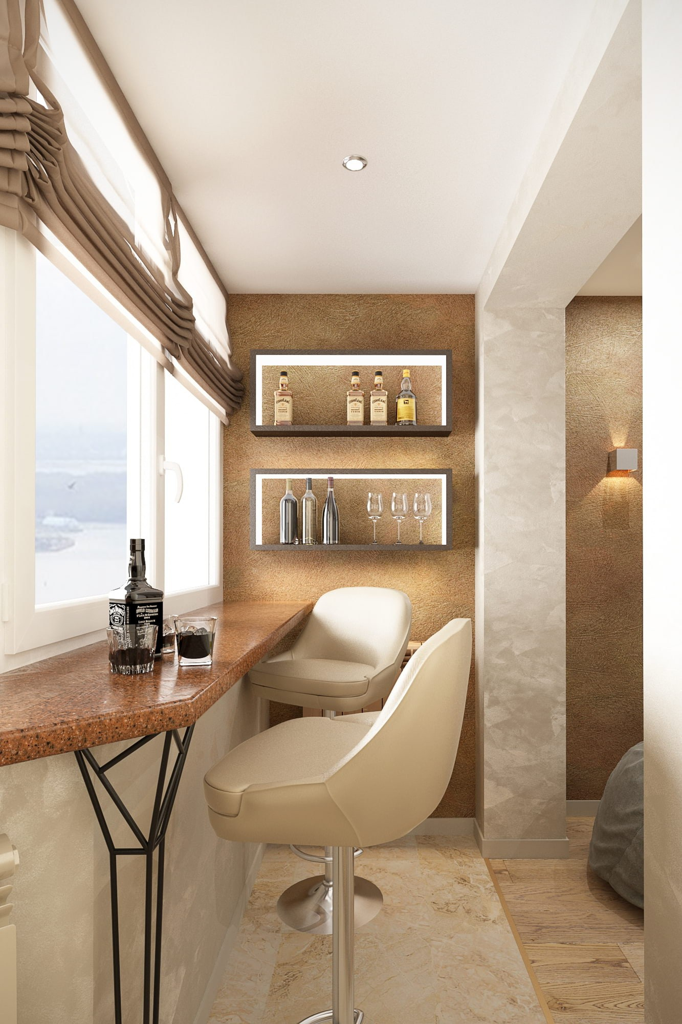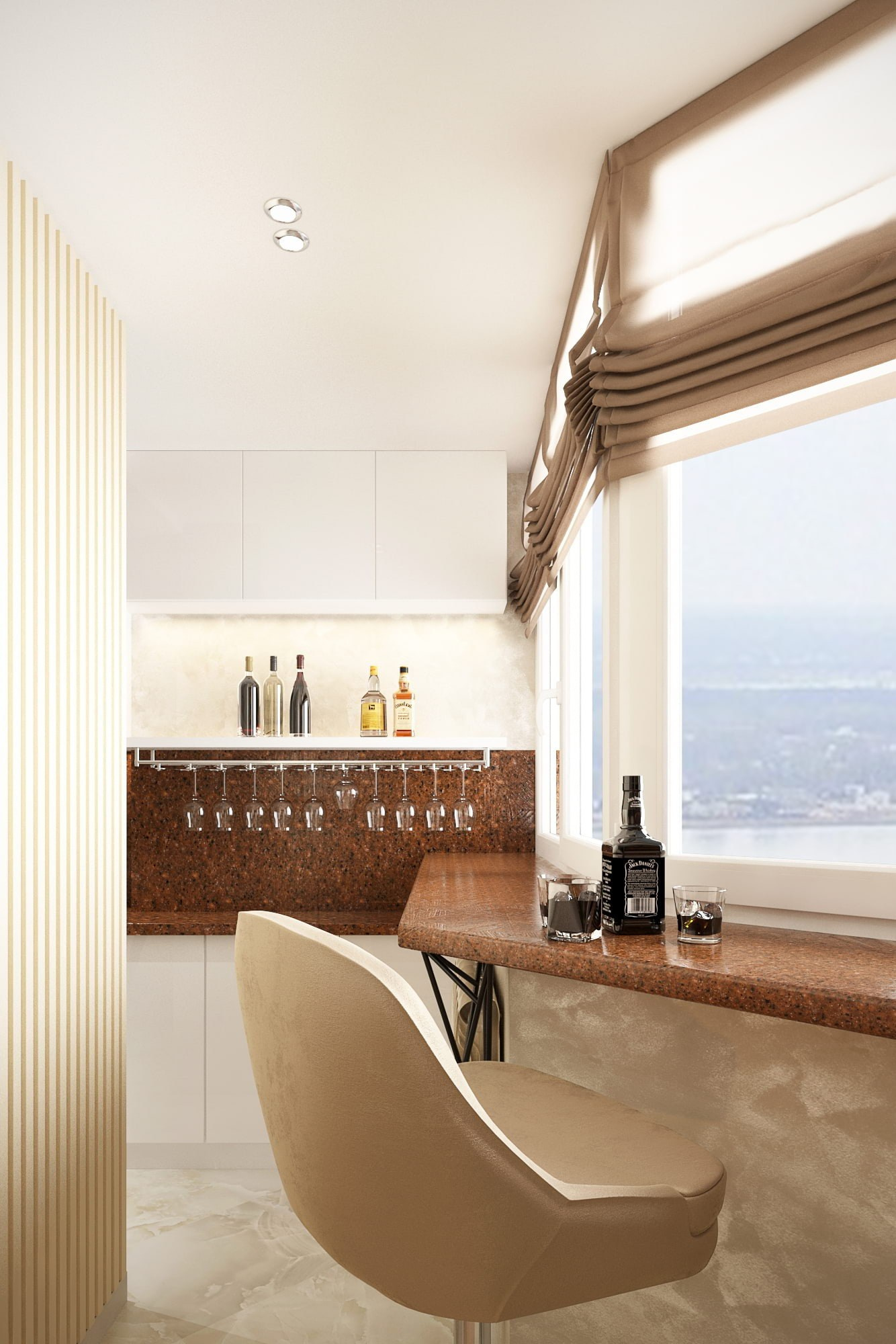 Часть кухни мы разместили на лоджии — таким образом получилось расширить рабочую зону. Подоконник тоже использовали — там оборудовали барную зону. Добавили полки с подсветкой, удобные кресла и обрамили окна римскими шторами.