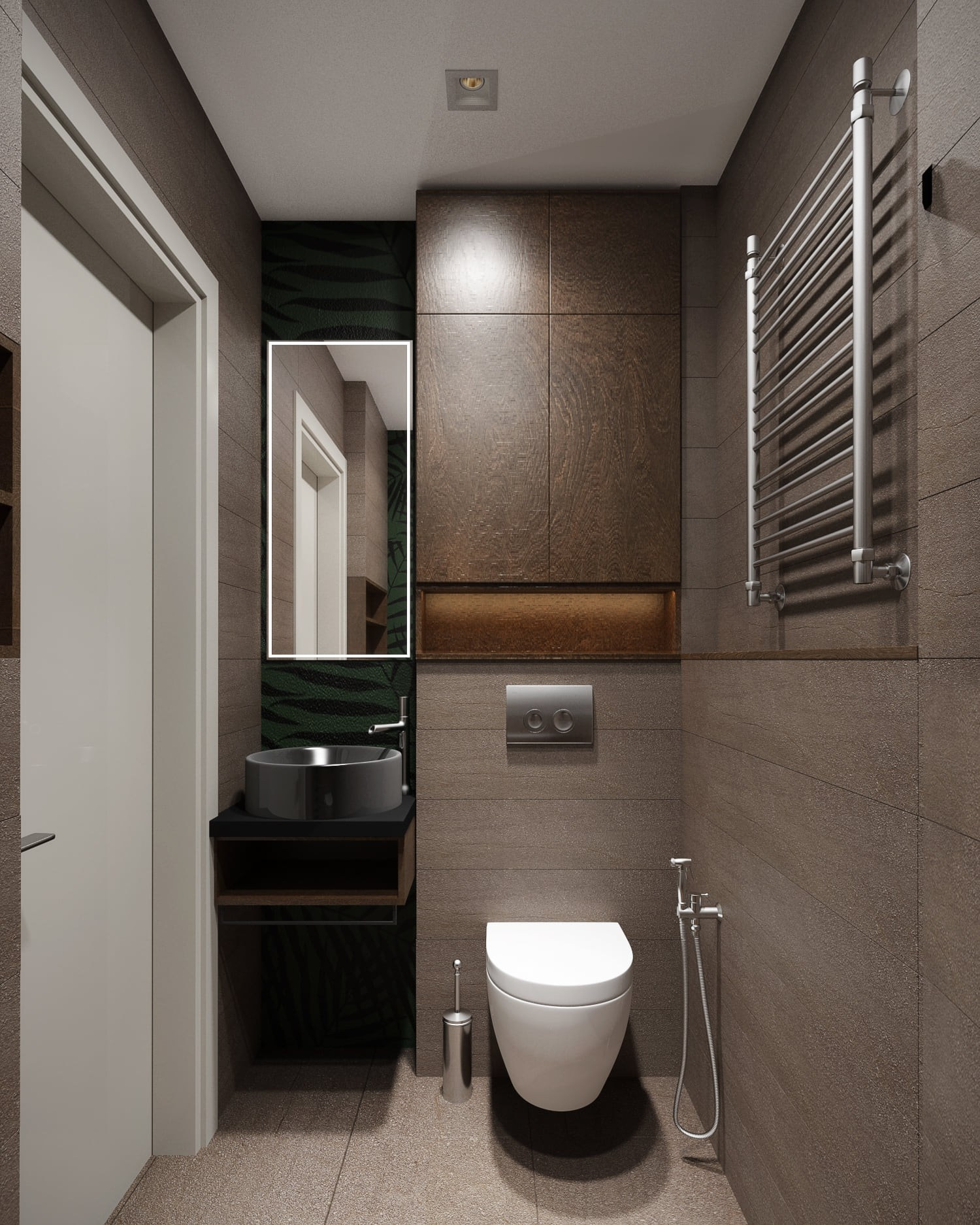 Ванные мы сделали разными по дизайну. В небольшой душевой получились настоящие тропики с росписью на стене и черной раковиной. А вот основная ванная комната — мягкая и нейтральная, как и весь дизайн этого проекта.
