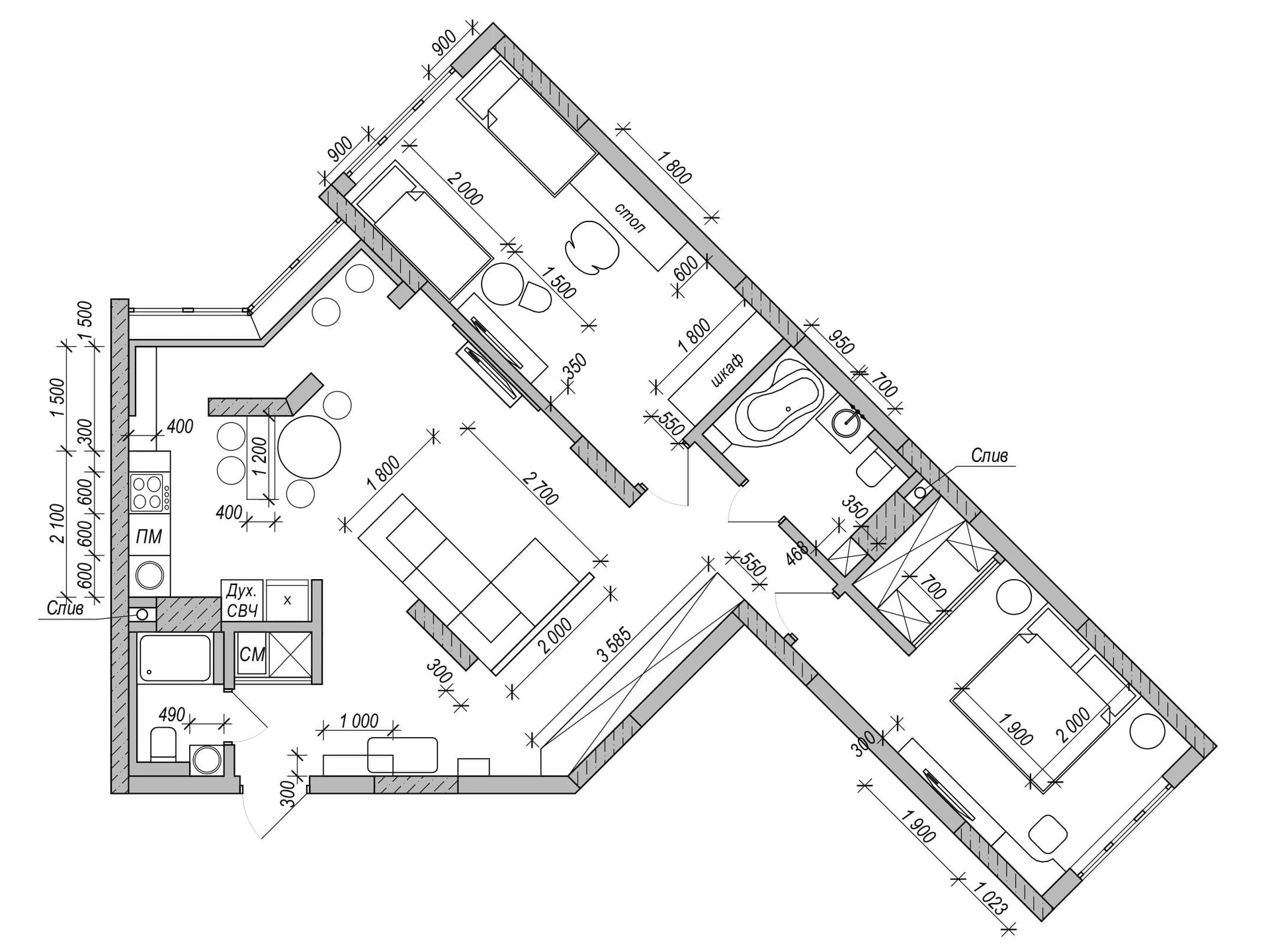 У этой квартиры в ЖК Ильинском ломаная геометрия, колонна посреди гостиной и недостаточно естественного света. Это также было необходимо учесть при разработке проекта.